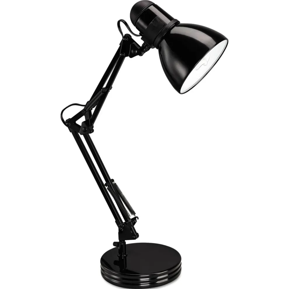 The workhorse lamp for any office, studio, or home. 2-point adjustable arm for maximum reach when you need it and out-of-the-way when you don’t. Adjustable shade rotation to focus light where needed. Includes tension knobs to lock arm and shade in working position. Tower style weighted base includes locking pin to prevent lamp from lifting during use. Metal base, arms and shade for maximum durability. 13W CFL bulb is included. Rotary on/off switch conveniently located on shade.