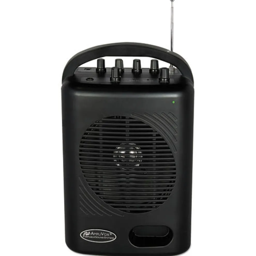 This PA system packs 50 watts of power into a unit weighing less than six pounds, reaching an audience size of 300 people with crystal clear sound. The wireless microphone has a range that allows the presenter to stand up to 100 feet away from the PA system while speaking. Built-in single channel VHF receiver in the unit allows for only one wireless microphone to be used at a time. An optional wired microphone can be plugged into the Power Pod PA to allow for dual presenters, with one presenter speaking from the wired microphone and the second presenter speaking from the wireless microphone. Loaded with a media player that gives you the ability to play recorded audio from a SD card or a USB thumb drive and includes FM radio with remote control. You can even record a presenter’s speech that is spoken into the microphone onto the thumb drive. The media player and FM radio is accessible by either using the control panel on the unit or the remote control. The unit runs up to eight hours off its internal rechargeable battery. A full set of controls include wired mic input with wired microphone volume, wireless microphone volume, wireless antenna, echo effect, auxiliary volume, tone control, MP3/FM volume and recharging connect.