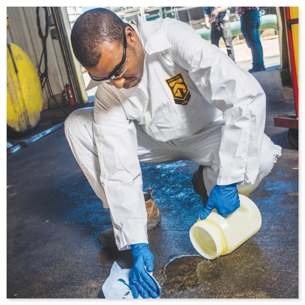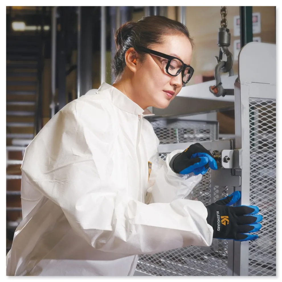 KleenGuard Personal Protective Equipment (PPE) enables rather than inhibitsallowing for maximum productivity and safety for you and your employees. When your workers are in nonstop contact with liquid splashes and particles, KleenGuard A40 Liquid and Particle Protection Coveralls are a great addition to offer your team comfortable protective clothing. Features to provide more protection include the seamless front (for primary exposure area) and 1 inch zipper flap. They feature REFLEX design, which offers excellent fit and comfort (with elastic in the back) and freedom of movement. Made of breathable, microporous film to keep out debris, non-hazardous liquid chemicals and dry particulates, the KleenGuard A40 material gives your employees a better liquid barrier and a better particulate barrier than the leading competitor. These coveralls with hood pass NFPA 99 for antistatic materials, and pass ASTM F1670 testing for penetration of blood and bodily fluids. Popular industries using this product include liquid handling, aviation, pharmaceutical manufacturing, general manufacturing and so much more. Making the right Personal Protection choice is difficult. Perform with distinction with KleenGuard Personal Protective Equipment (PPE).