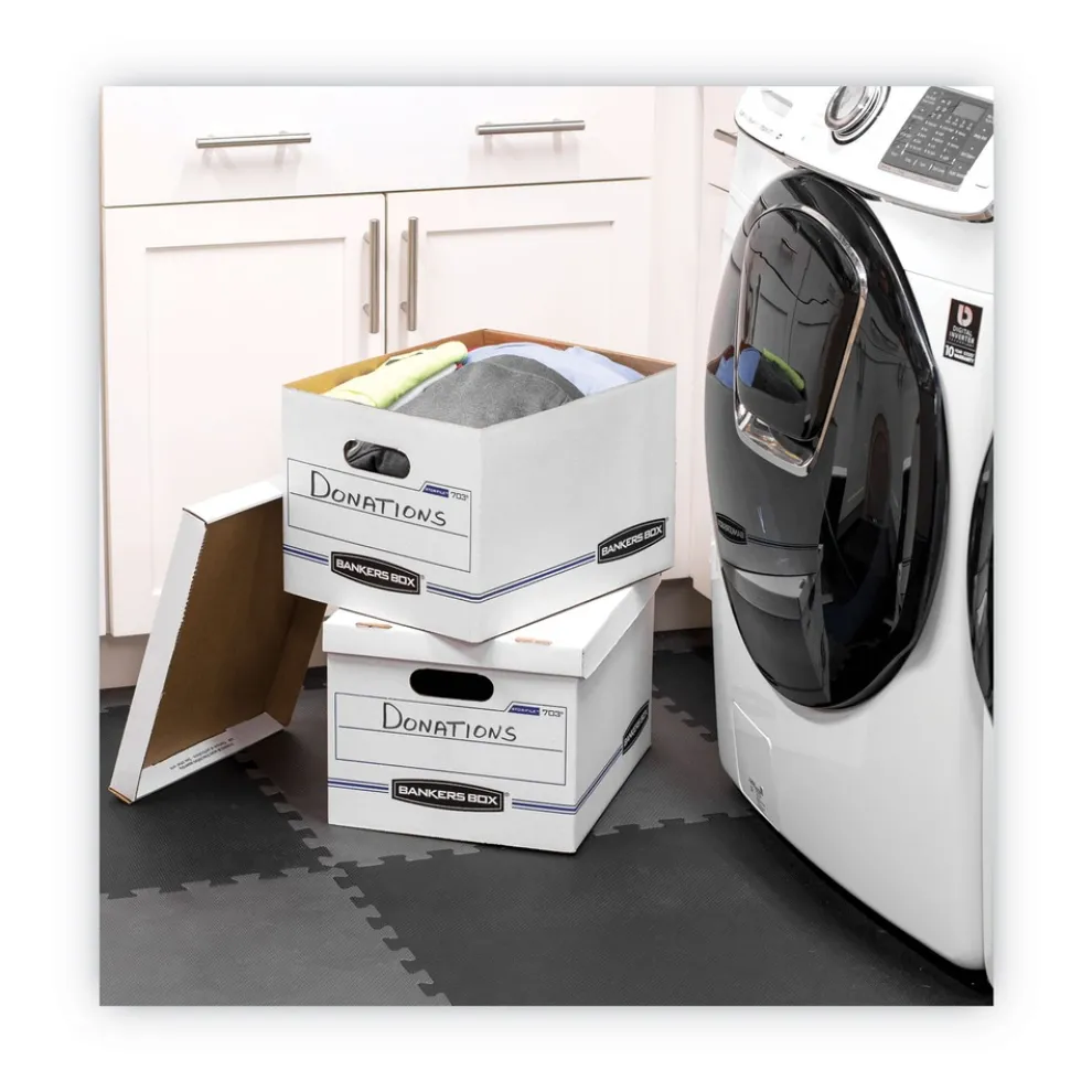 Bankers Box Store/File Basic Duty Storage Boxes feature double-end, single-side construction. Lift-off lid ships attached to prevent lid loss, then tears off for use. Light-duty, basic set-up construction for moderate stacking or use with shelving. Lift-off lid that stays attached until ready to use. Great for storing important papers, home and office items that you want to store away for future use. Made from corrugated cardboard.