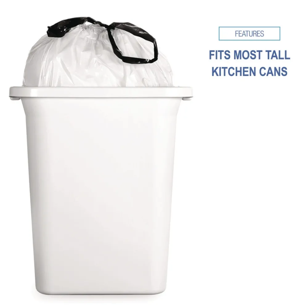 Boardwalk drawstring kitchen bags are easily opened and closed with highly visible, red draw tape closure. Durable bag and closure keep contents secure and contained. White, 13-gallon, plastic trash bags fit in most tall kitchen waste receptacles and are designed to maximize can capacity. Can be tied around the top or fastened around the top rim of can.