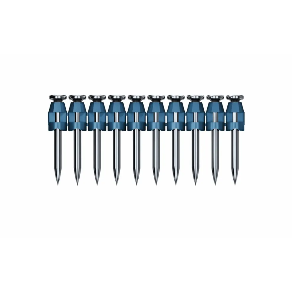 Bosch collated concrete nails are designed for use with the GNB18V-12 Cordless 18V Concrete Nailer. Ideal for framing, the fasteners attach metal tracks to concrete. The Bosch 18V concrete nailer comes with both a 22-Shot collated magazine (an extra-capacity magazine, which can hold up to 44 Collated pins, is sold separately), and a single shot nose piece. The nails and the GNB18V-12 Concrete Nailer were tested and certified together (ICC). The Cordless nailer is an ideal replacement for gas-powered concrete nailers, because it eliminates the need for consumable gas cartridges. The easy-to-use depth adjustment uses an intuitive sliding switch. The nails are available in five different lengths, from 5/8 in. to 1-1/2 in.
