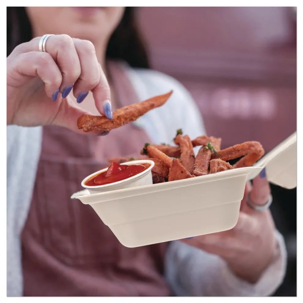 A forward-thinking twist on the classic carryout container! Elevate your takeout and delivery with bagasse containers that have no intentionally added PFAS. Cut-resistantcontainers are the perfect packaging for salads, sandwiches and entrees. Save time preparing orders thanks to the hinged lid design. Stable stacking and secure closure help securely package and transport meals. Serve hot and cold foods with confidence. These microwaveable containers are suitable for customers to reheat and enjoy. Whether you’re delivering the best takeout in town, dishing up food truck fare or serving dinner at the deli counter, these hinged lid containers made from bagasse provide a sustainable and high-quality solution.