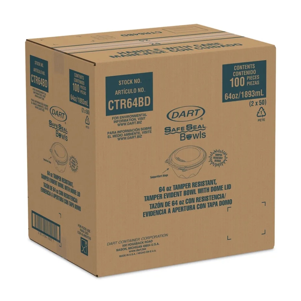 (100/Carton) 64 oz. 8.9 in. Diameter x 4 in. Plastic Tamper-Resistant Tamper-Evident Bowls with Dome Lid – Clear – CTR64BD
