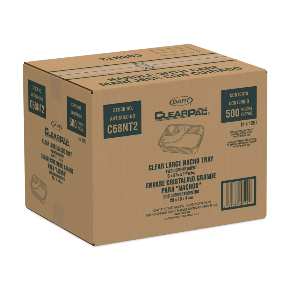 Dart C68NT2 ClearPac 6.2 in. x 6.2 in. x 1.6 in. 3.3 oz. 2-Compartments Plastic Nacho Tray – Large Clear (500/Carton)