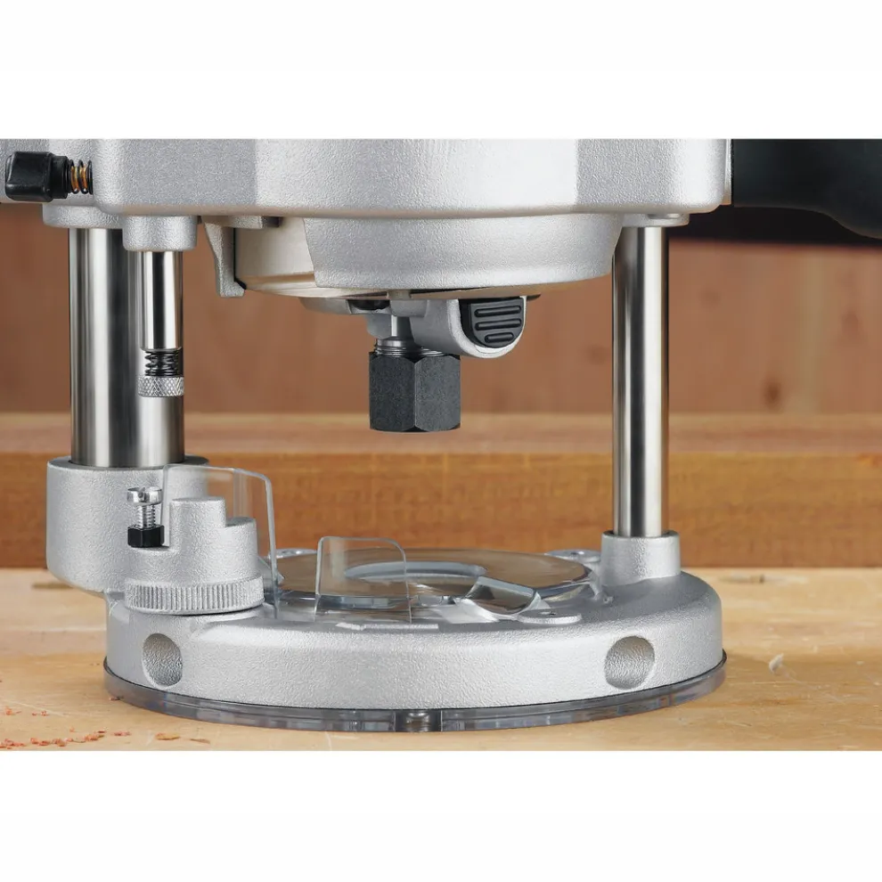 Adjustable tool-free steel motor cam lock makes depth adjustment and base changes quick and solid locking