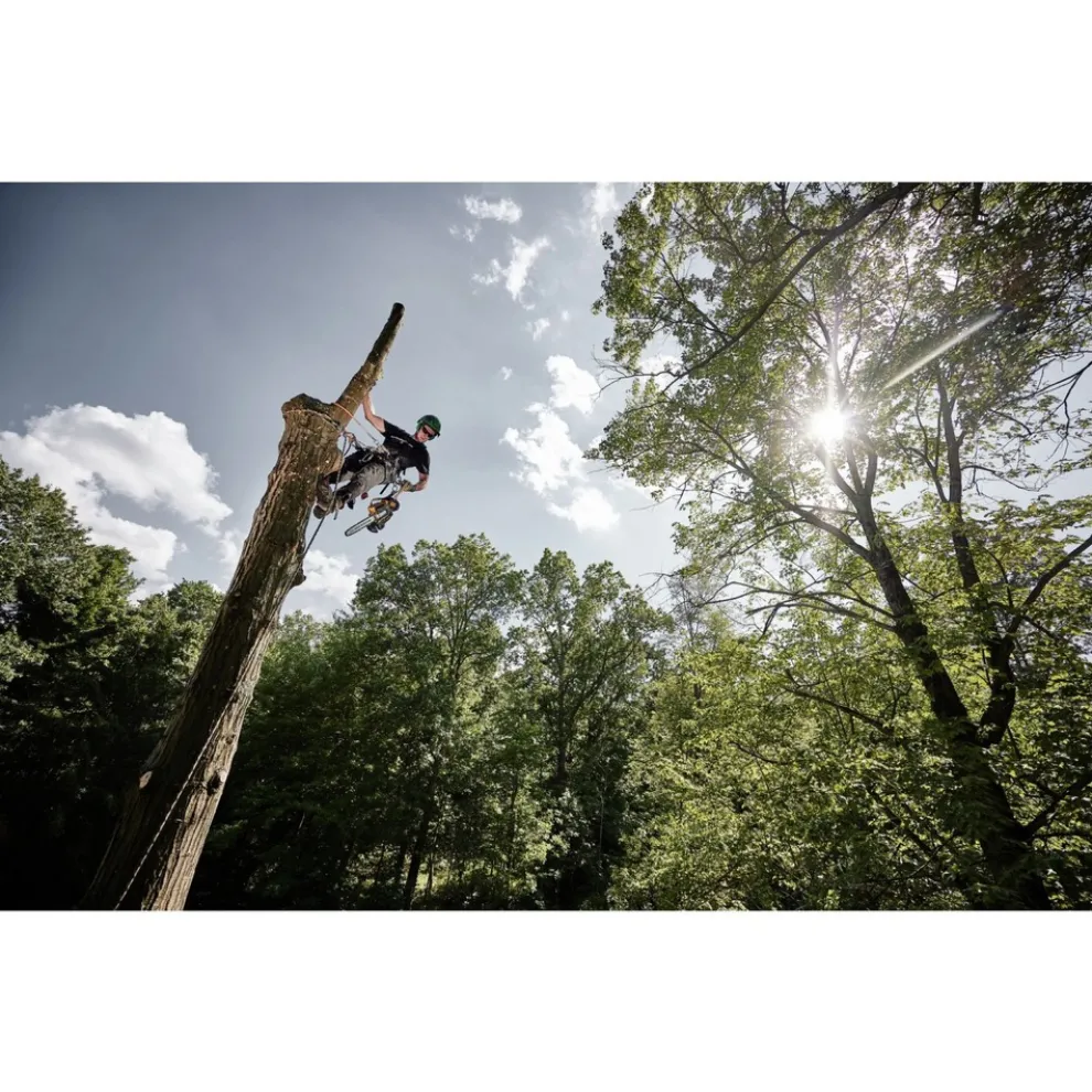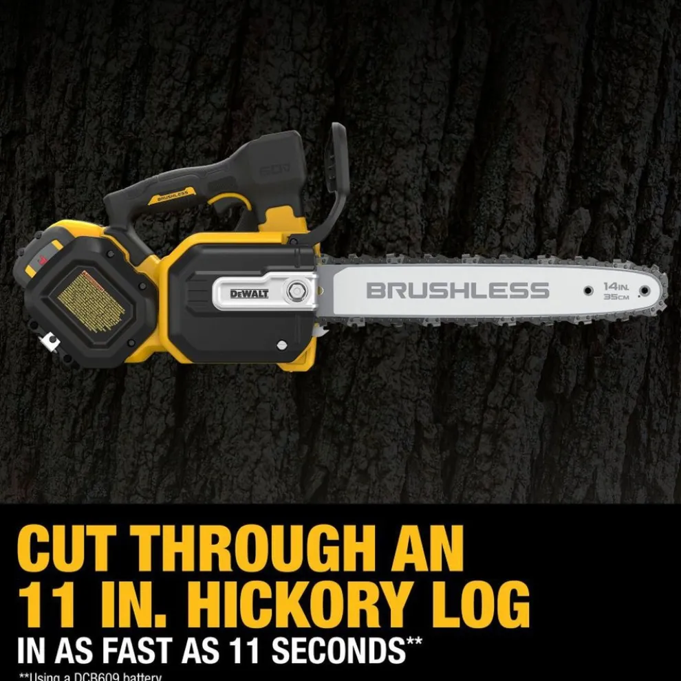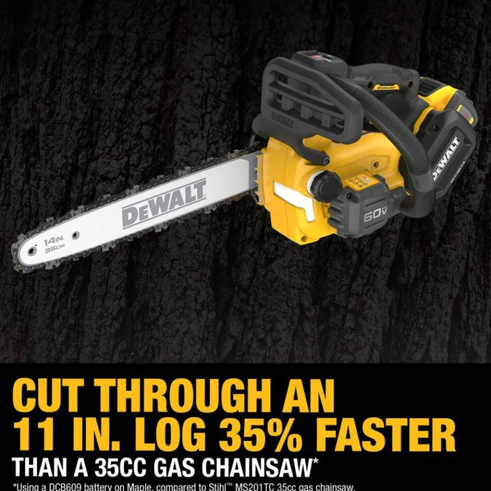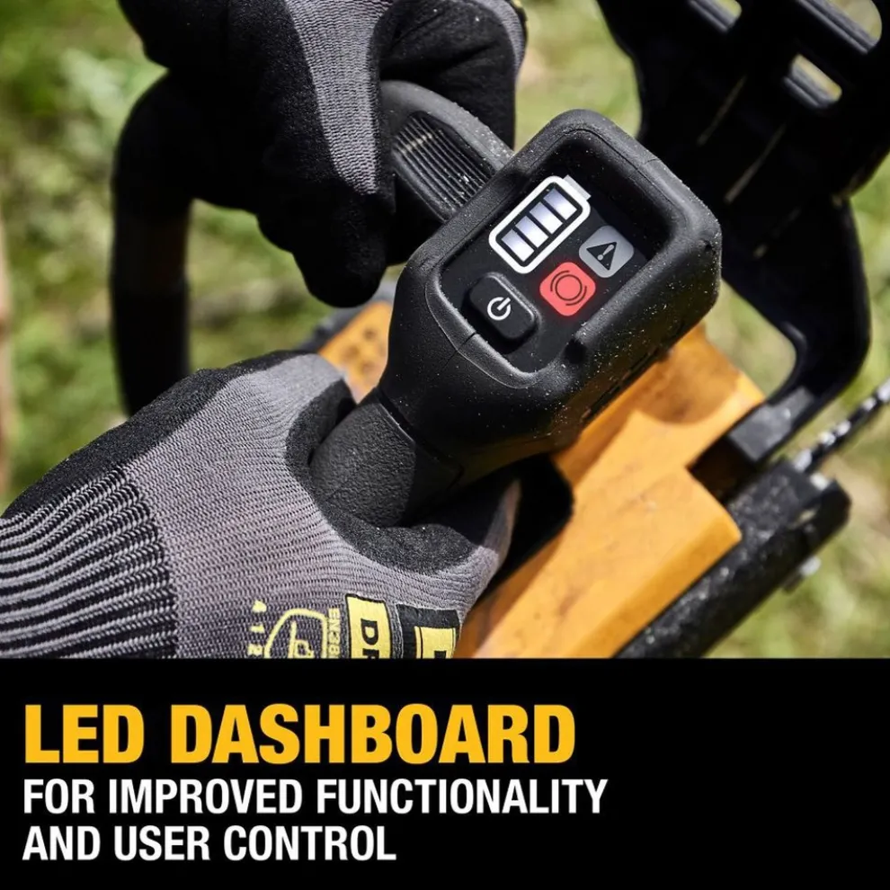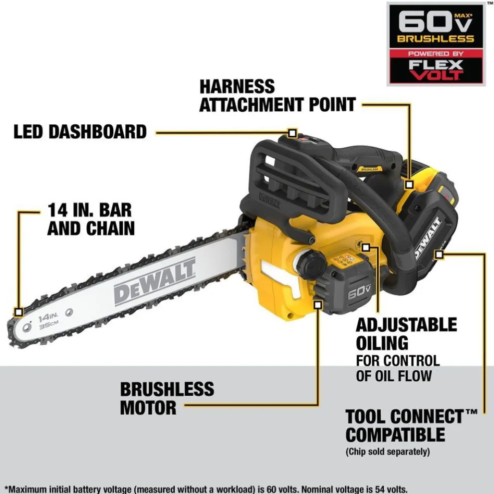 Built for the experienced tree professional, the 60V MAX 14 in. Top Handle Chainsaw uses advanced FLEXVOLT batteries to maximize power without the hassles of gas. Cut through an 11 in. log up to 35 percent faster than a 35cc gas chainsaw with up to 2.4 HP and a chain speed of 23 m/s. Engineered to deliver optimal maneuverability while operating in difficult areas, this saw is ideal for tree pruning and removal. Powered by FLEXVOLT batteries, this saw has the capacity to make 160 cuts per charge on 4×4 pressure-treated pine. Equipped with an adjustable oiler, D-ring harness attachment point, tooled tensioning, inertia chain brake, metal bucking spikes, and an LED dashboard, this 60V MAX 14 in. Top Handle Chainsaw is designed to charge through demanding jobs.