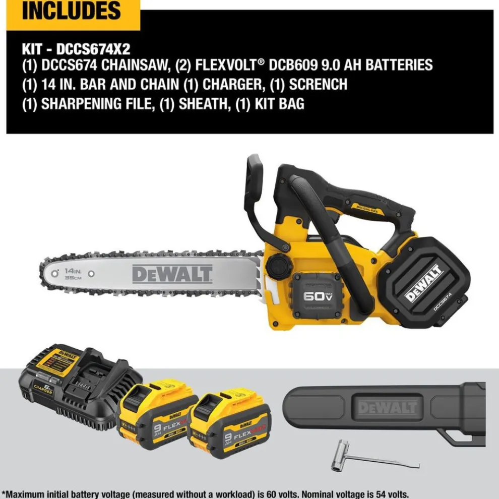 Dewalt DCCS674X2 60V MAX Top Handle Lithium-Ion 14 in. Cordless Chainsaw Kit with 2 Batteries (9 Ah)