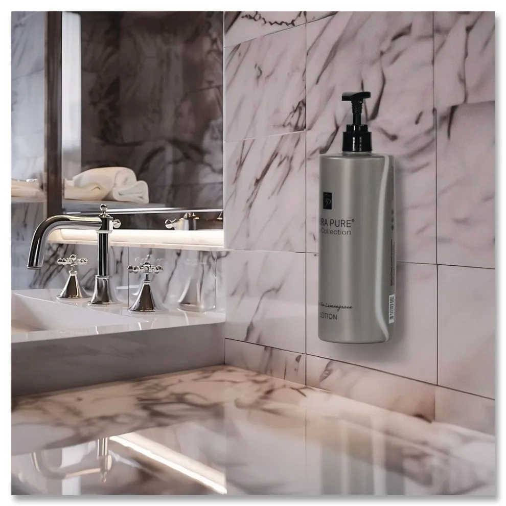 Featuring the refreshing fragrance of green tea and lemongrass, the Terra Pure Body Lotion deeply moisturizes, leaving skin soft, smooth and hydrated. The formulas are paraben- and gluten-free, a thoughtful choice for guests. The EcoLux Air Pump dispenser works with a concealed tamper-resistant bracket (sold separately) to create a sleek system with modern seamless lines. To change out the long-lasting bottle, a quick press of the key releases the empty dispenser bottle. Then simply slide down a fresh body lotion bottle to lock in place. The effortless process significantly reduces housekeeping time for overall cost savings. The Terra Pure Collection offers more than just lotion, elevating standards in elegance, sustainability and service.