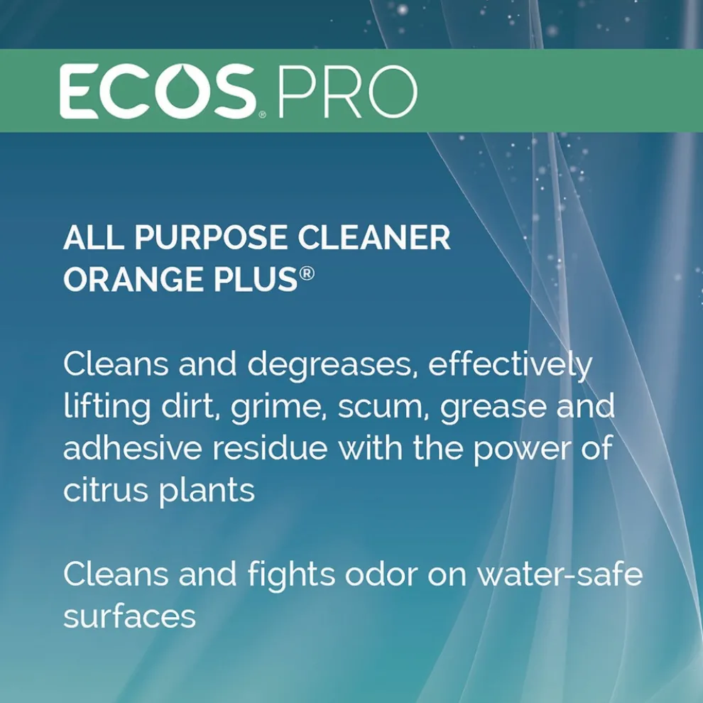 ECOS PRO Orange Plus is an all-purpose cleaner and degreaser that effectively lifts dirt, grime, scum, grease, and adhesive residue with the power of citrus plants. Use it to clean and fight odors on water-safe surfaces. This formula is made using sustainable, plant-powered ingredients. Made without dyes; gray water and septic safe. Features a refreshing citrus scent. Not tested on animals. Manufactured in a facility that is LEED Zero Carbon, LEED Zero Waste, and LEED Zero Energy Certified.