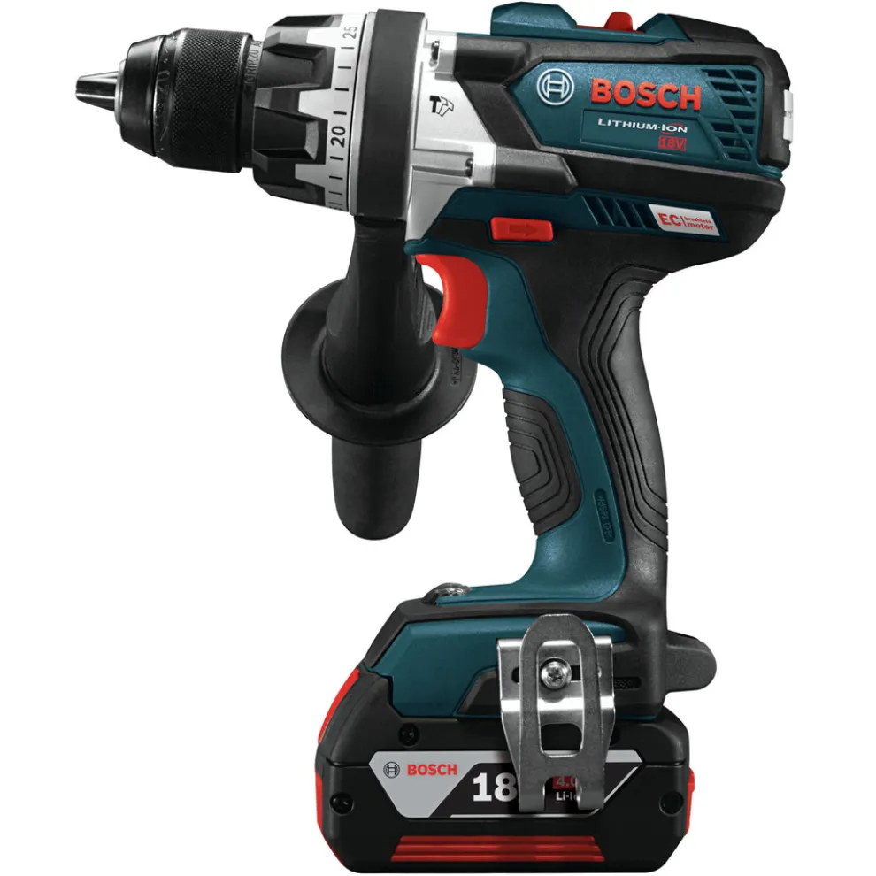 The Bosch HDH18301RT 18V EC Brushless Brute Tough 1/2 in. Hammer Drill/Driver Kit features a tool with professional power for heavy-duty drilling and driving around the jobsite, including metal and masonry. The HDH18301RT also has KickBack Control, an integrated sensor that stops the drill’s rotation during bit bind-up situations, helping to reduce the risk of user injury. The hammer drill features a precision clutch, with 25+1 settings, for reduced fastener damage. Powered by Bosch’s efficient EC Brushless motor, it delivers up to 663 in-lbs. of torque – with a no-load BPM of 0-31,500 and a no-load RPM of 0-2,100 RPM. The drill has an upgraded all-metal chuck for more durability. It is more comfortable to use, with a sure-grip side-assist handle and improved grip-zone design.