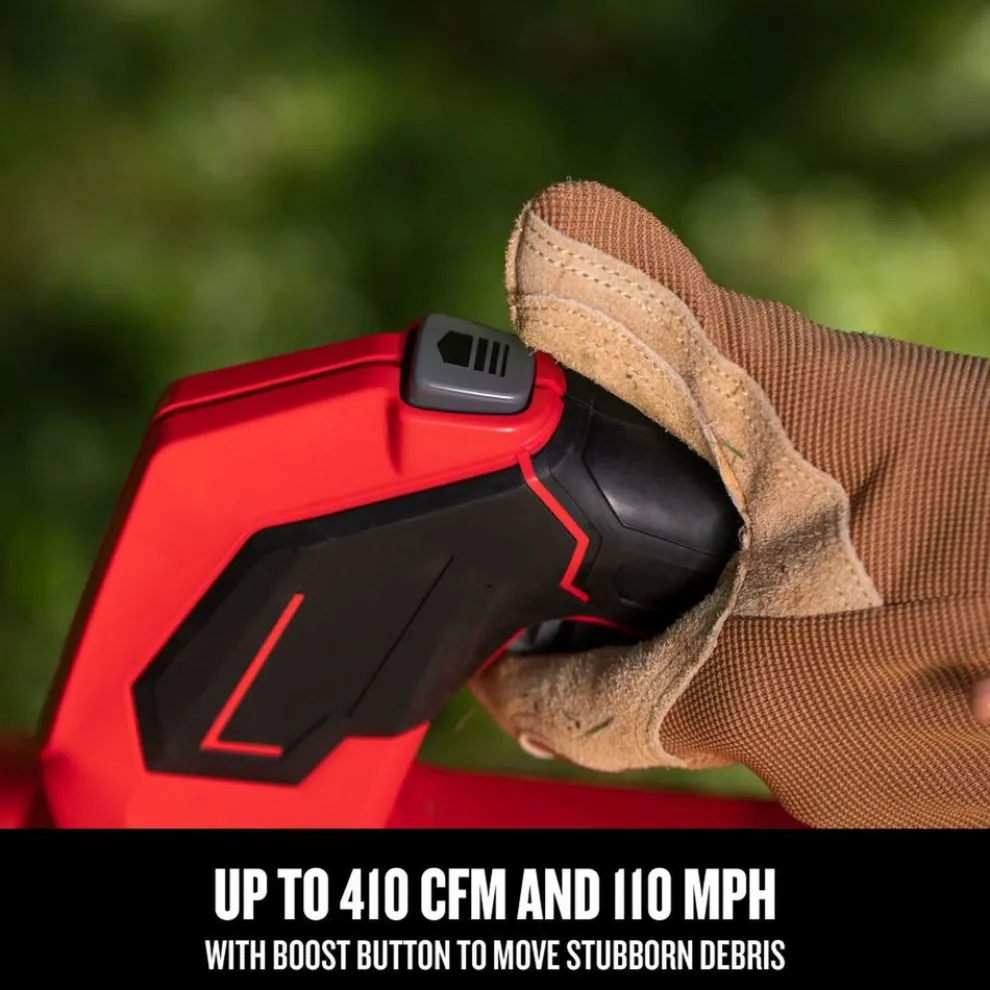 Boost button: Up to 410 CFM and 110 MPH with boost button to move stubborn debris.