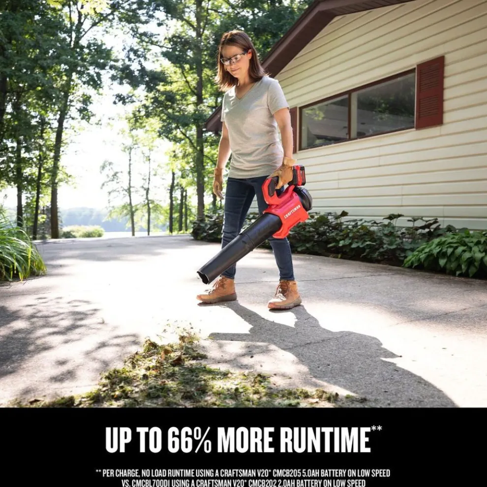 Power meets performance. V20 cordless brushless RP axial blower features a powerful brushless motor and is equipped with a 5 Ah battery providing you with more runtime and better performance. Powerful performance with up to 66% more runtime and up to 37% more force. The V20 battery platform is compatible with CRAFTSMAN V20 outdoor equipment and power tools. You’ll find the complete line of outdoor tools and equipment essentials for a job to make you proud.