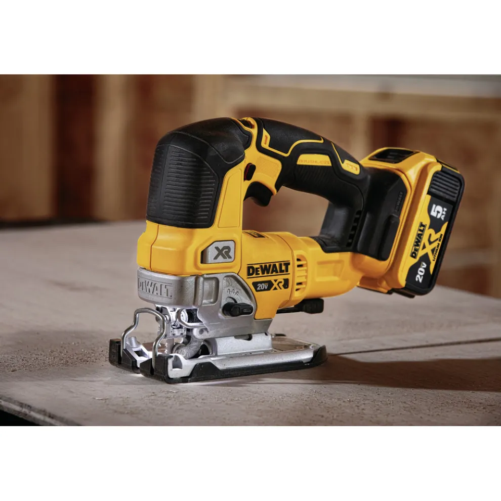 Our 20V MAX XR Cordless Jig Saw features an efficient motor for powerful performance and extreme runtime. Precisely control blade speed up to 3,200 SPM with the variable speed trigger and dial, for professional results no matter what you’re cutting. 4-position orbital action lets you adjust for optimal cutting of a variety of materials. A bright LED light illuminates dim work surfaces and makes it easy to follow cut lines. The updated all-metal, lever-action keyless blade clamp is designed for quick and easy blade changes of t-shank jig saw blades. Also keyless, the shoe bevel is easy to adjust with detents at 0 degrees, 15 degrees, 30 degrees, and a positive stop at 45 degrees. A removable shoe cover helps protect materials from scratches, and an integrated dust blower helps remove dust and debris from your line of sight as you cut.