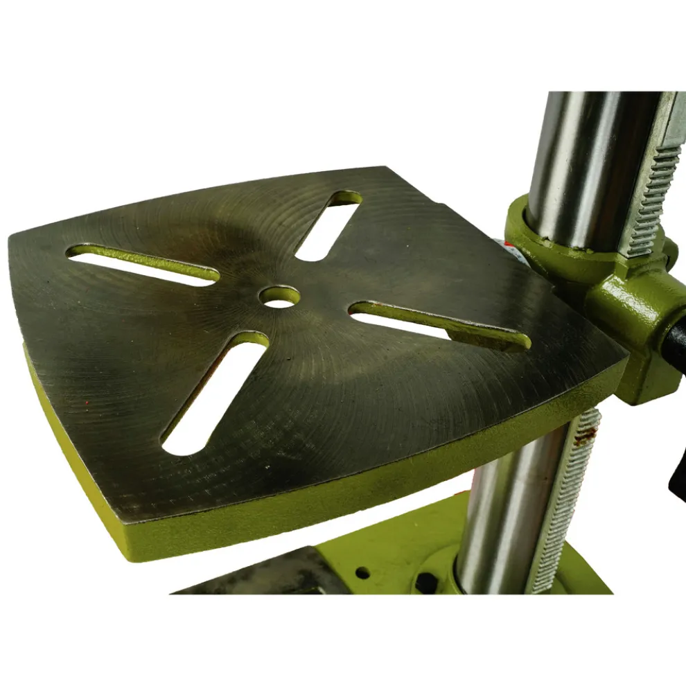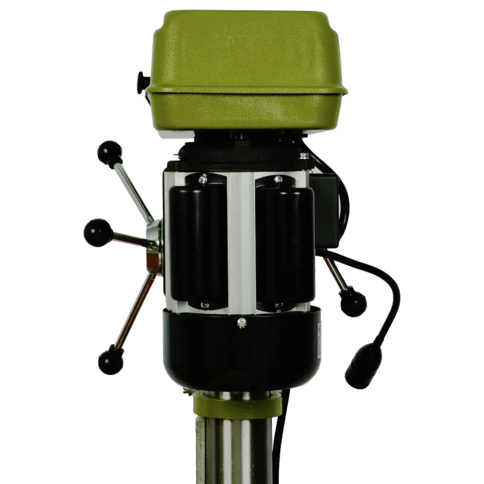 The GI 12 in. Commerical Benchtop VSD drill press with Forced opening line interrupter switch, requires machine restart in case of power failure or circuit interruption. Global patented laser, regular chuck and adjustable spindle tension return spring. Built-in laser pointer. Sturdy design with cast-iron head, base, and table. High-quality bearings for smooth, vibration-free operation. Simple hand lever controlled mechanical variable speed from 500 to 3000 rpm. Digital spindle speed display. 1/3 HP industrial-quality, 120 V motor. Equipped with easy to adjust dual depth stop for complete control of both down stroke depth and upstroke travel. 5/8 in. chuck with key & convenient onboard chuck key holder. Easy to use see-through flip-up chuck guard included. Crank-operated rack and pinion table height adjustment.