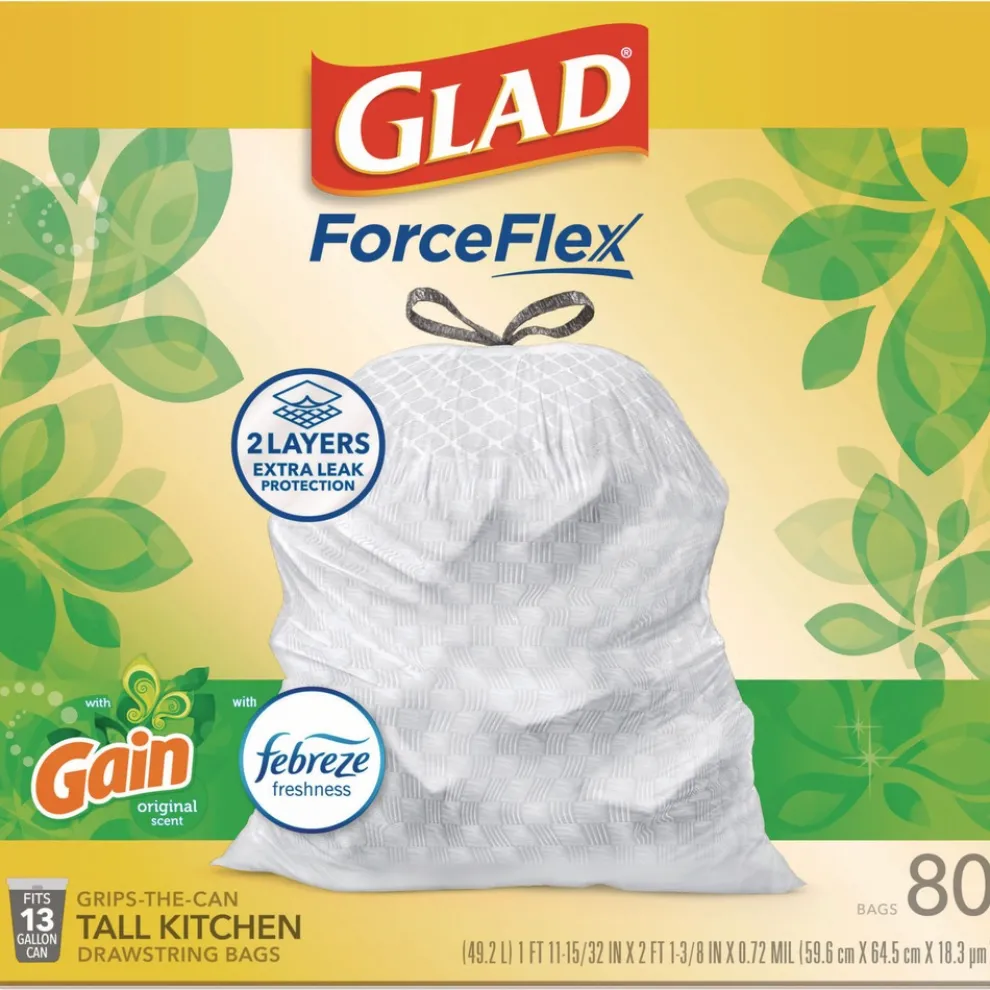 Fight nasty kitchen odors with Glad trash bags. Glad Kitchen Drawstring Trash Bags are designed with ForceFlex technology to give extra flex as it expands around sharp edges and heavy loads, so you can pack it in while resisting tears, rips and punctures. Keeps your kitchen smelling pleasantly fresh with long lasting odor control. Let the stretchable strength of Glad handle all the messes our busy daily life can throw at it and then some. With double-sided seals and a reinforced bottom, these bags are designed with RipGuard and LeakGuard technology to prevent seepage of liquids and keep trash contained. The durable Grips-The-Can Drawstring ensures a tight grip on the trash can to keep it in place. Take the trash to the curb with no fear of leaks and tears, and no frustration. Keep your kitchen smelling clean with the stretchable strength of Glad. Ideal for use in offices, schools, daycare centers, restaurants, hotels and other commercial facilities.