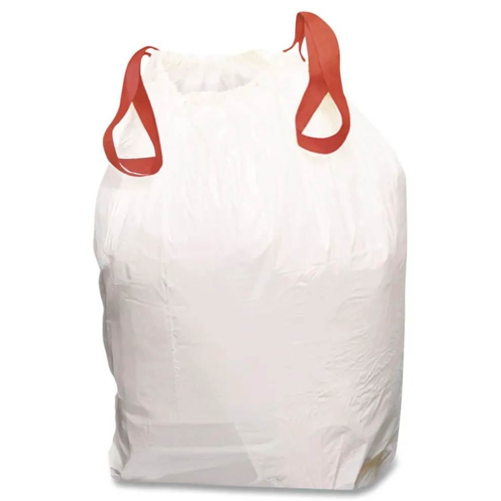 Drawstring closure on bags keeps everything clean and free from trash. Linear low density resin for greater stretch and puncture resistance. Comes in a low count convenience pack. Strong enough to hold all residential household and break room garbage.