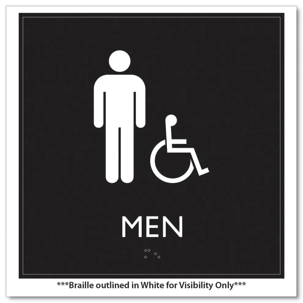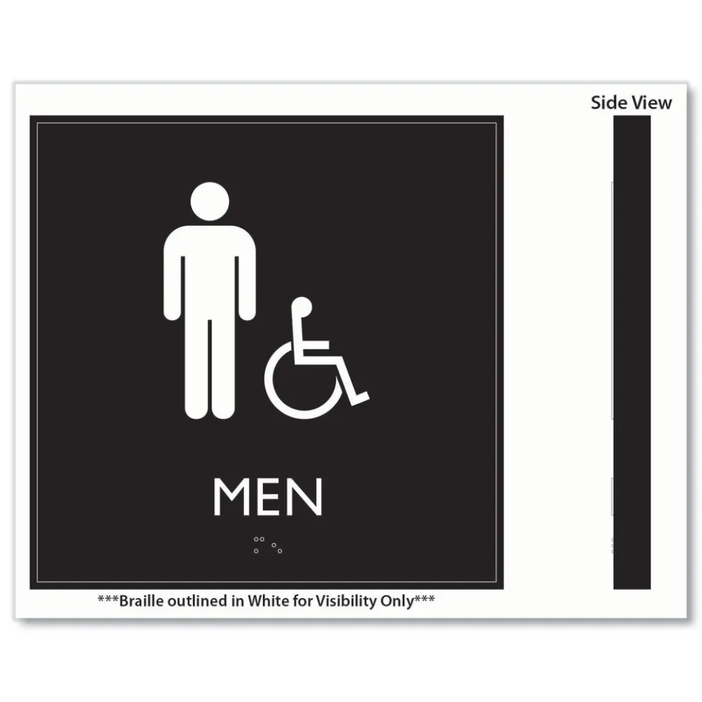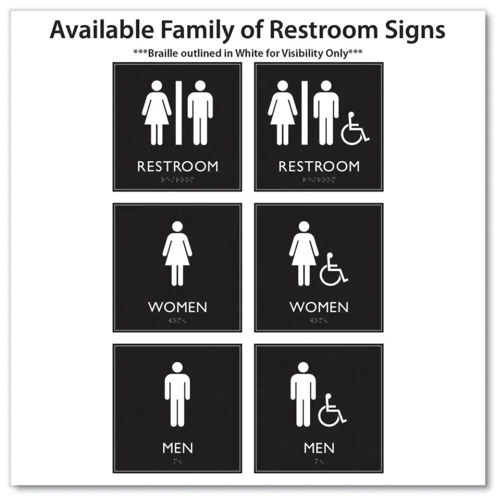 Universally and easily recognizable white graphics. Raised tactile graphics with Grade 2 Braille. Meets Americans with Disabilities Act (ADA) requirements. Includes double-side adhesive tape for mounting to door or wall.