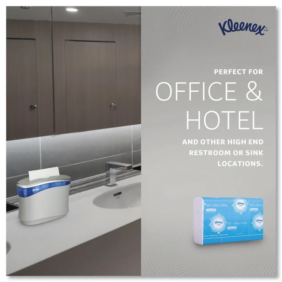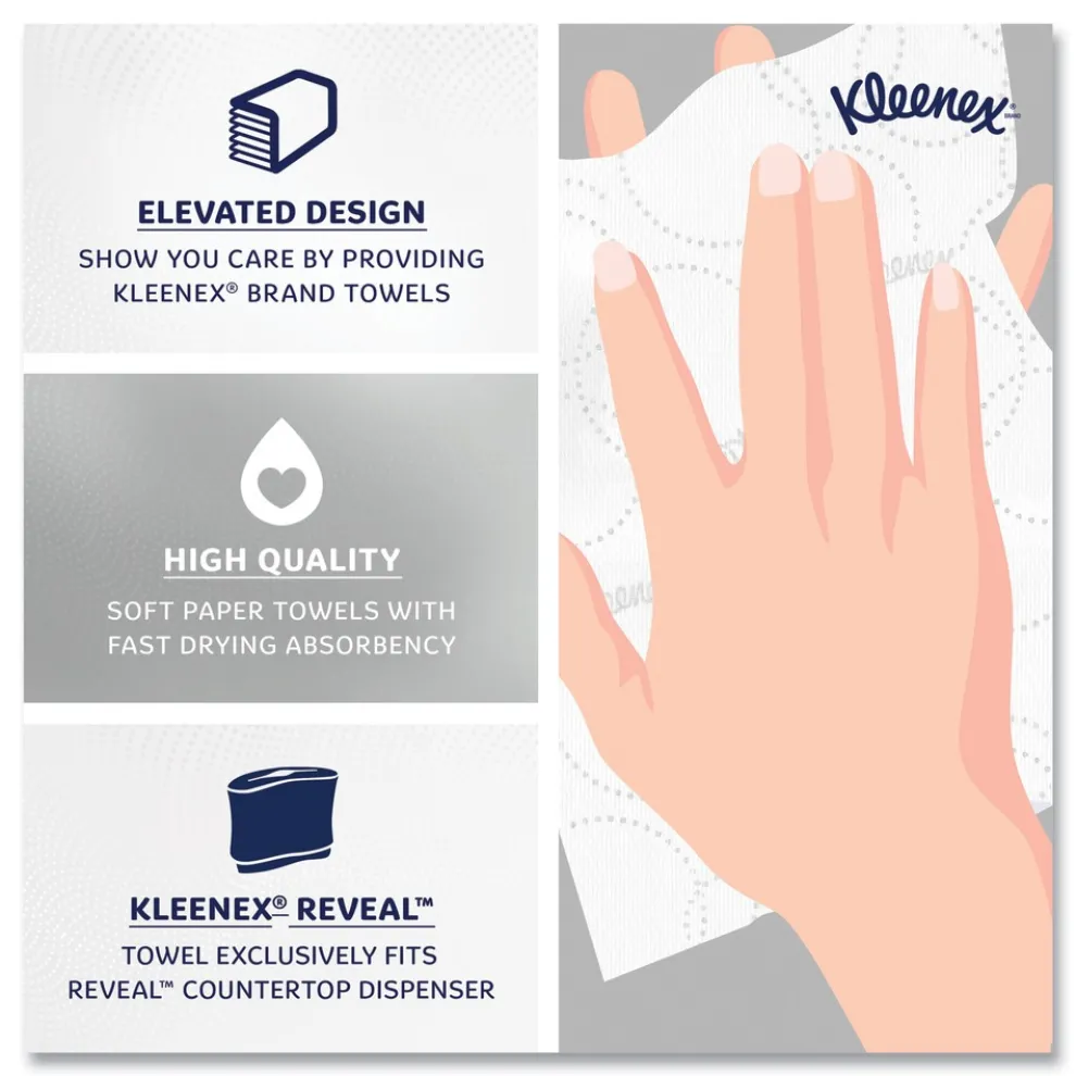 Using Kleenex Reveal Hand Towels with the Kleenex Reveal Countertop System offers your restroom guests an upgraded hand drying experience. Visitors take a towel without taking a step, so you can say goodbye to water splashes and sprays on floors and countertops. You’ll say hello to a solution that elevates the cleanliness and image of your facility by dispensing superior Kleenex Hand Towels. The white towels are embossed with the trusted Kleenex logo and offer a balance of softness and strength to dry hands thoroughly. These towels dispense one at a time, so you only touch the towel you use. Throw away those germs and you’ll enjoy peace of mind when it comes to the hygiene of your staff and your guests.