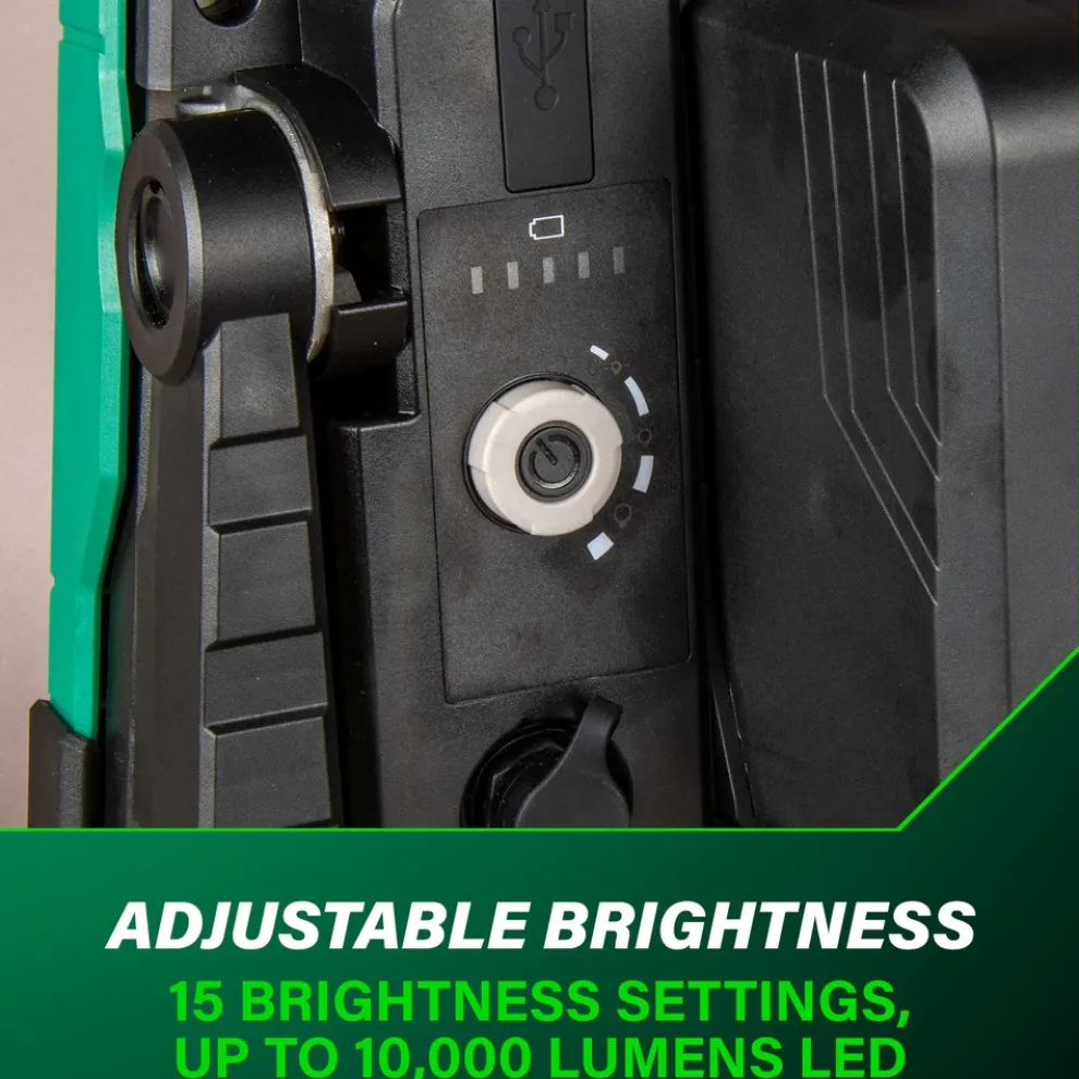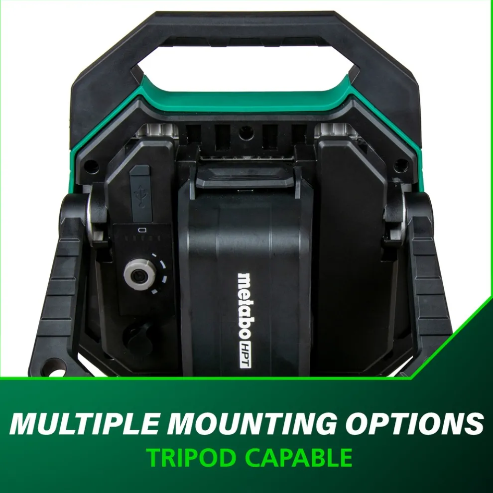 The Pro Preferred Brand of Pneumatic Nailers introduces a new addition to our Lighting Solution category with a Cordless 10000 Lumen LED Work Light (model UB18DDQ4)! Bring light with you no matter when or where the job takes you. Use the UB18DDQ4 to light up all your outdoor jobs thanks to the 15 brightness level settings. With an IP65 rating you know that neither dust or water will keep you from completing your job. Connect and charge your smartphone or tablet to the UB18DDQ4 via the built in USB port. Use the two 16mm holes to mount your light in the optimal position or install a tripod (not included) using the 5/8 in. threaded screw hole. Get up to 14.5 hours of runtime on the 8 Ah battery BSL36B18 (not included). The 18V Cordless LED Work Light is part of the ever-expanding MultiVolt System of 18V and 36V power tools from Metabo HPT. GO lighter with 18V batteries or GO longer with the unique MultiVolt battery that works on both 18V and 36V tools to double your runtime for more power on the GO.