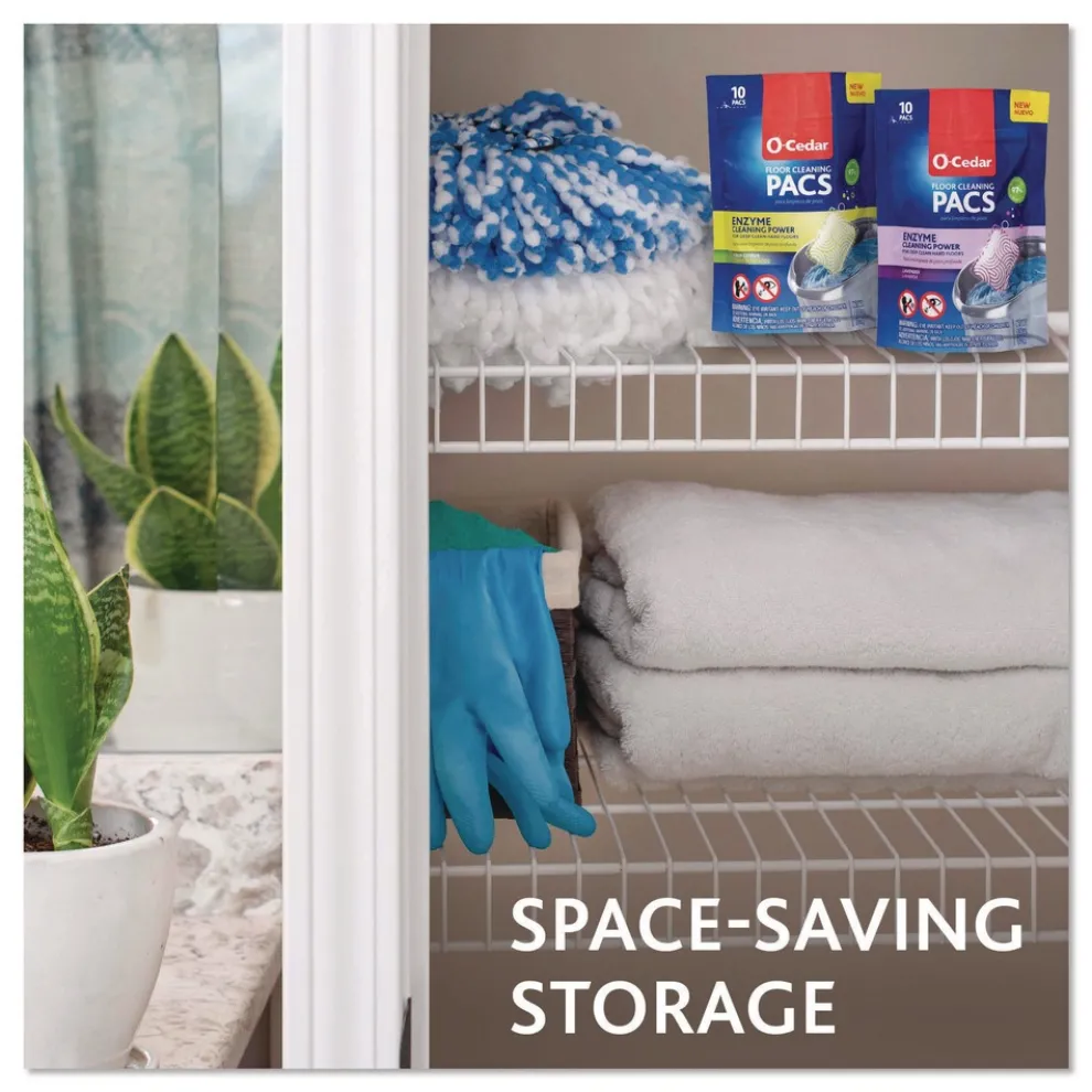 Take the guesswork out of cleaning your floors with the convenient and perfectly portioned O-Cedar PACS. Mixed with 1.6 gal. of water, each PAC has the deep cleaning power to clean every hard-surface floor in your home, including hardwood, tile, vinyl and laminate. Simply drop one O-Cedar PAC into your EasyWring or RinseClean bucket, and you’ll see the bubbles fizz. Then, it’s time to mop! Naturally-derived enzymes dissolve stubborn dirt and grease for a streak-free clean, without any harsh chemicals.