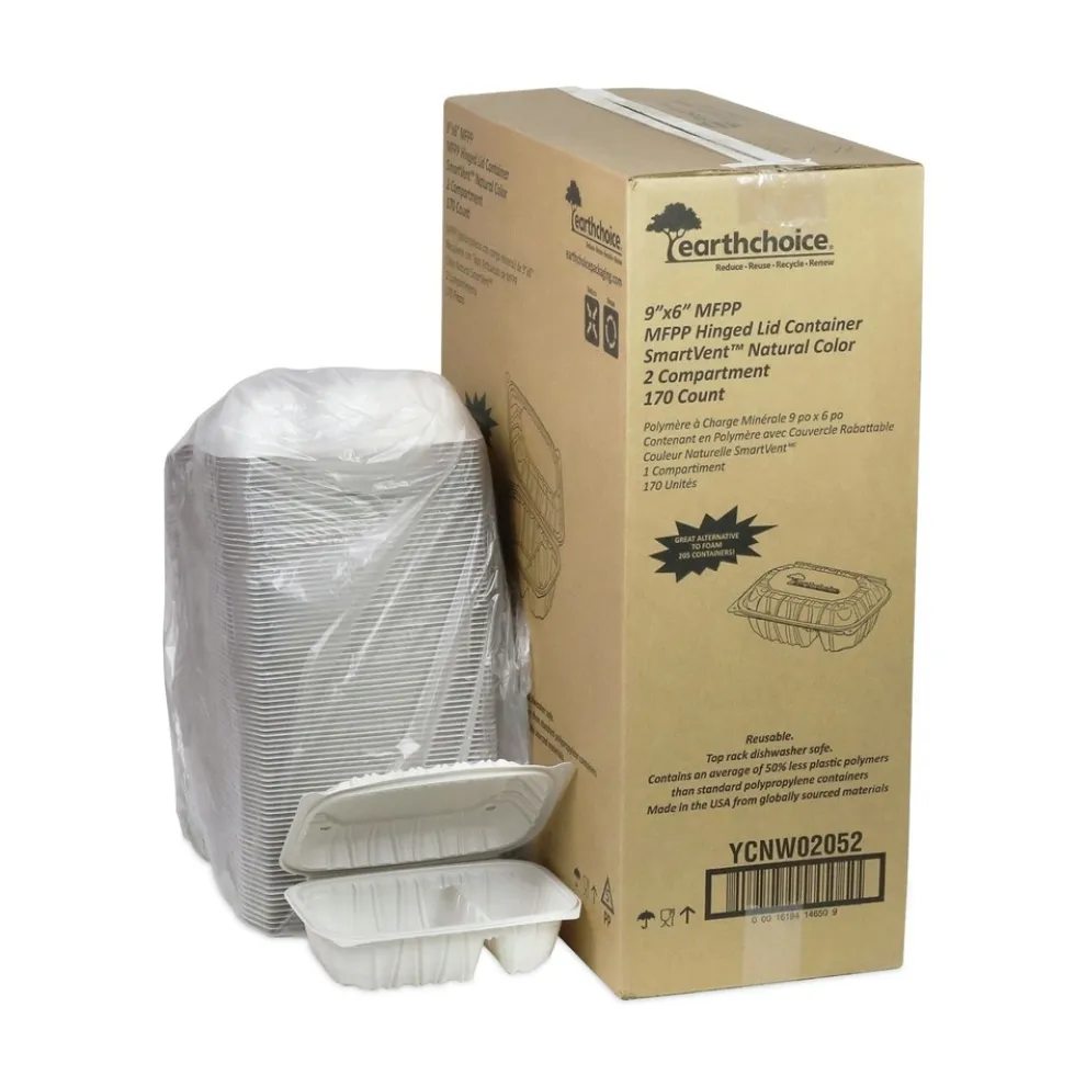 (170/Carton) 2-Compartment 9 x 6 x 3.1 EarthChoice Vented Microwavable MFPP Plastic Hinged Lid Container – White – YCNW02052