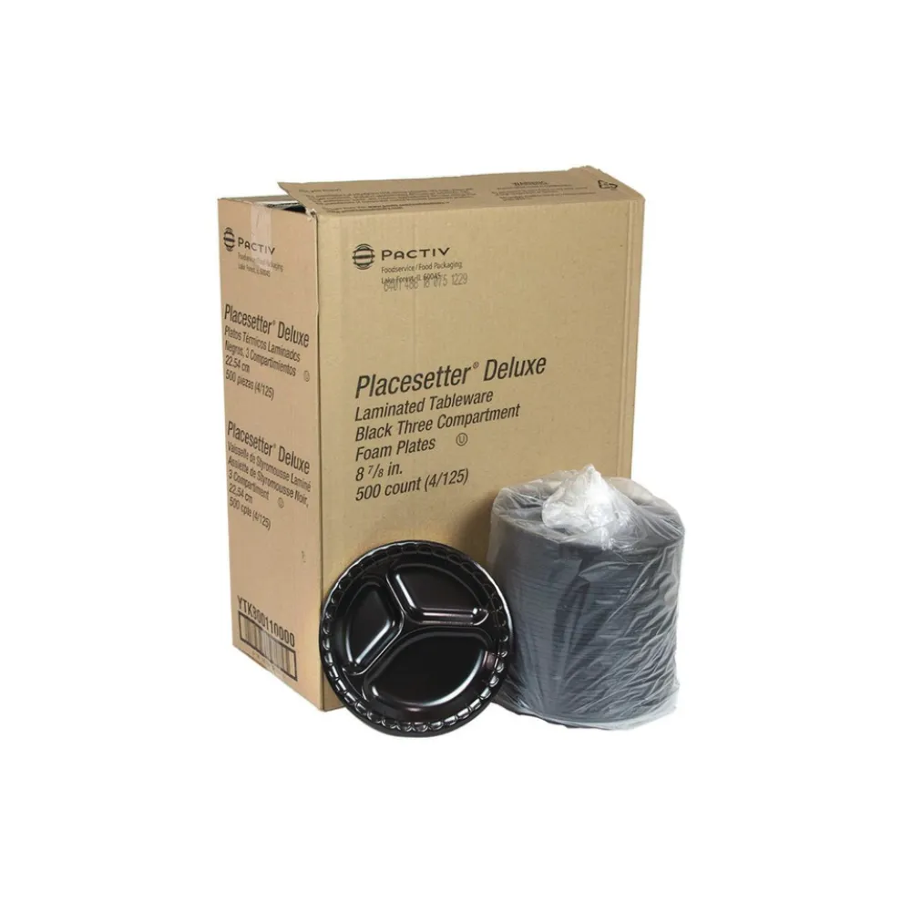 (500/Carton) 9 in. Diameter 3-Compartment Placesetter Deluxe Laminated Foam Dinnerware Plate – Black – YTKB00110000