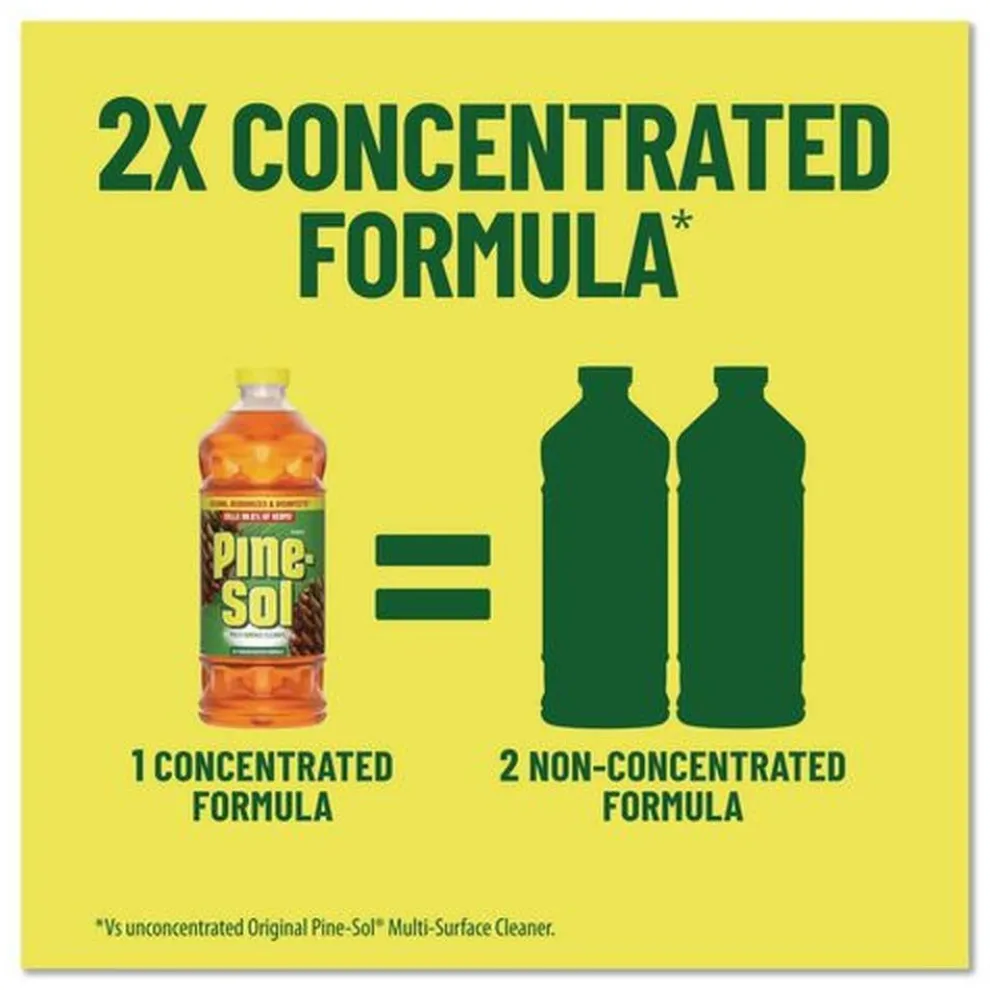 With Pine-Sol Multi-Surface Cleaner Disinfectant Concentrated, you only need one cleaner to fight tough dirt, grease and grime. This improved 2X concentrated formula lasts 2X longer than the previous Pine-Sol Pine formula. EPA registered to kill 99% of germs, Pine-Sol gives you 5X cleaning action as it deodorizes, cuts through grease, removes grime, tackles dirt and removes 99% of allergens, all while leaving a classic scent. One bottle does it all. Pine-Sol is suitable for use on sealed wood, tile, stone, porcelain, glass and more when used as directed. Do not use on marble, aluminum, copper or wood that is unfinished, unsealed, unpainted, waxed, oiled or worn.