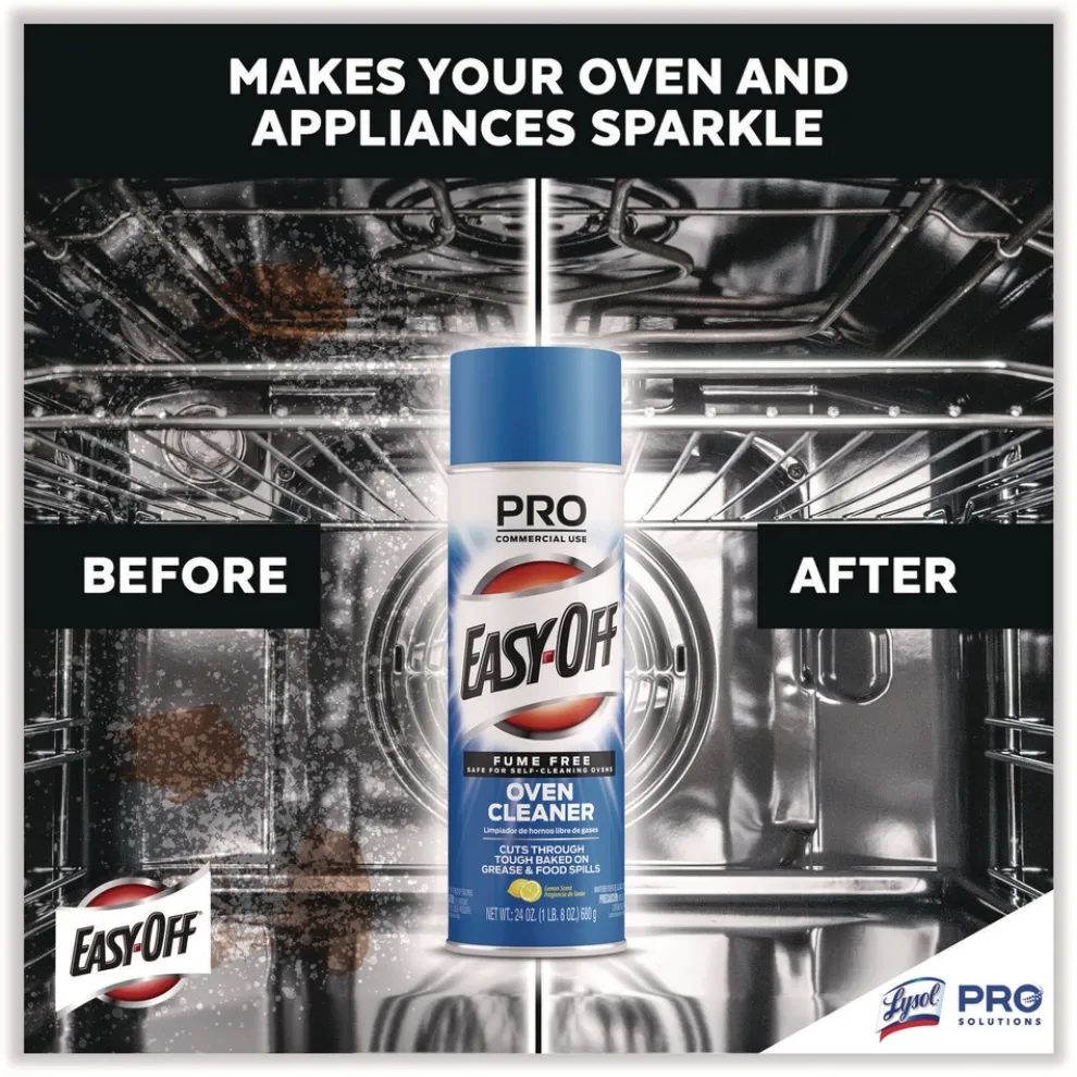 Cut through tough, baked-on grease in seconds and without the fumes using Professional EASY-OFF Fume Free Oven Cleaner. Simply spray, wait 30 to 60 seconds, and wipe away for an effective, efficient spot clean. Give cleaning crews a safe formula they can use during operating hours that dissolves tough baked-on grease, food spills, and common kitchen soils. Cover both daily upkeep and longer oven cleans with the fume-less formula, leaving behind only a pleasant lemon scent. Arm employees with a versatile cleaner that works on the interiors of ovens, oven doors, barbecue grills, stainless steel surfaces, broilers and broiler pans. Safe for self-cleaning ovens and requires no heat or gloves to use.
