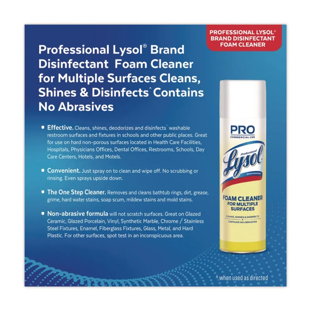 This rich foam clings to surfaces to kill Staph, Salmonella, Pseudomonas, E-coli HIV-1 (AIDS Virus) and other germs on hard, nonporous surfaces when used as directed. Its unique aerosol valve allows spraying from any position-even upside down to clean, shine, disinfect and deodorize. This product eliminates odors and prevents growth of mold and mildew. Use on fiberglass, glazed porcelain, synthetic marble, glazed tile, hard plastic and vinyl.