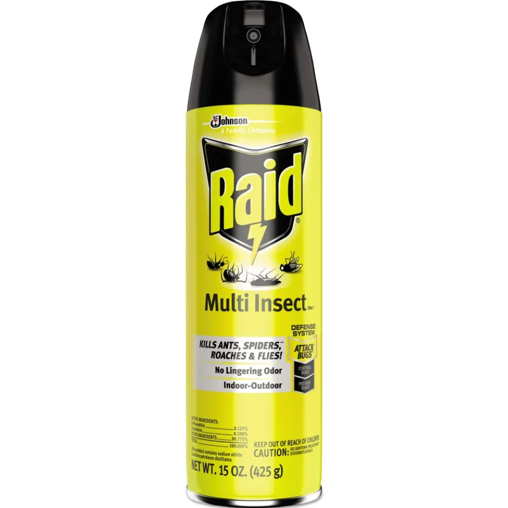 Raid Multi-Insect Killer is specially formulated to kill both crawling and flying insects. Kills most common household insects with no lingering odor. Good for indoor and outdoor use. Great for use on carpets, draperies, and no-wax floors. Use to kill Ants, Bedbugs, Boxelder Bugs, Carpet Beetles, Crickets, Firebrats, Fleas, Flies, Fruit Flies, Hornets, Mosquitoes, Non-biting Gnats, Pillbugs, Roaches, Silverfish, Small Flying Moths, Sow Bugs, Spiders, Wasps, and Water Bugs.