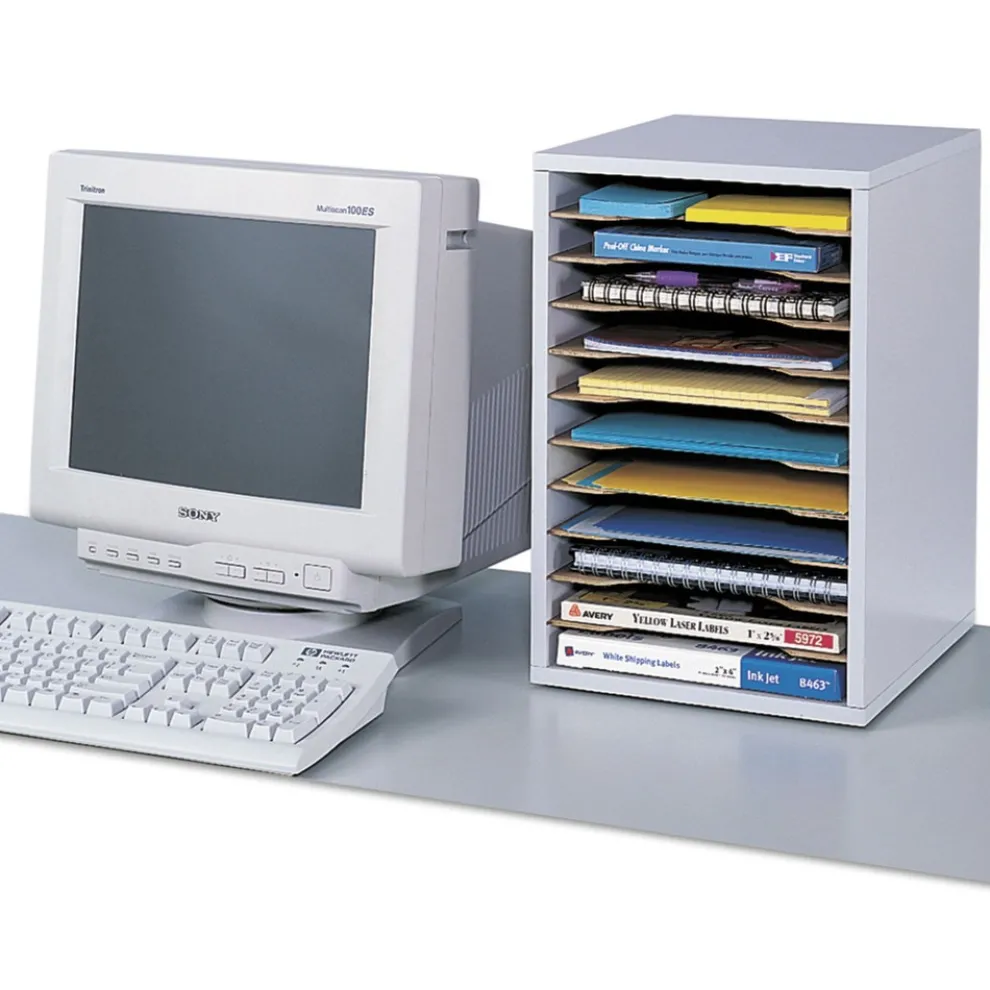 Vertical desktop sorter is compact for maximum desktop organization. Shelves are removable only during assembly so you can customize the compartments. 10 hardboard shelves form up to (11) 9-1/2 in. W x 11-5/8 in. D x 1-1/4 in. H letter-size compartments and support up to 15 lbs. each. Made of 1/2 in. compressed wood with laminate finish; solid fiberboard back.