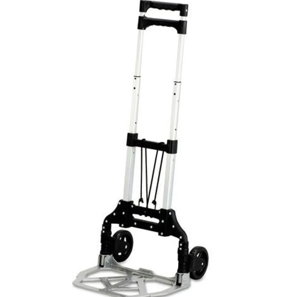 The Safco Stow and Go Cart is a folding hand cart featuring a lightweight aluminum frame. The hand truck folds down to the size of a briefcase, fits under a car seat or in airplane overhead compartment. The mobile hand cart rests on 5 in. diameter rubber, retractable wheels and is navigated via a telescoping handle. Rated up to 110 lbs.