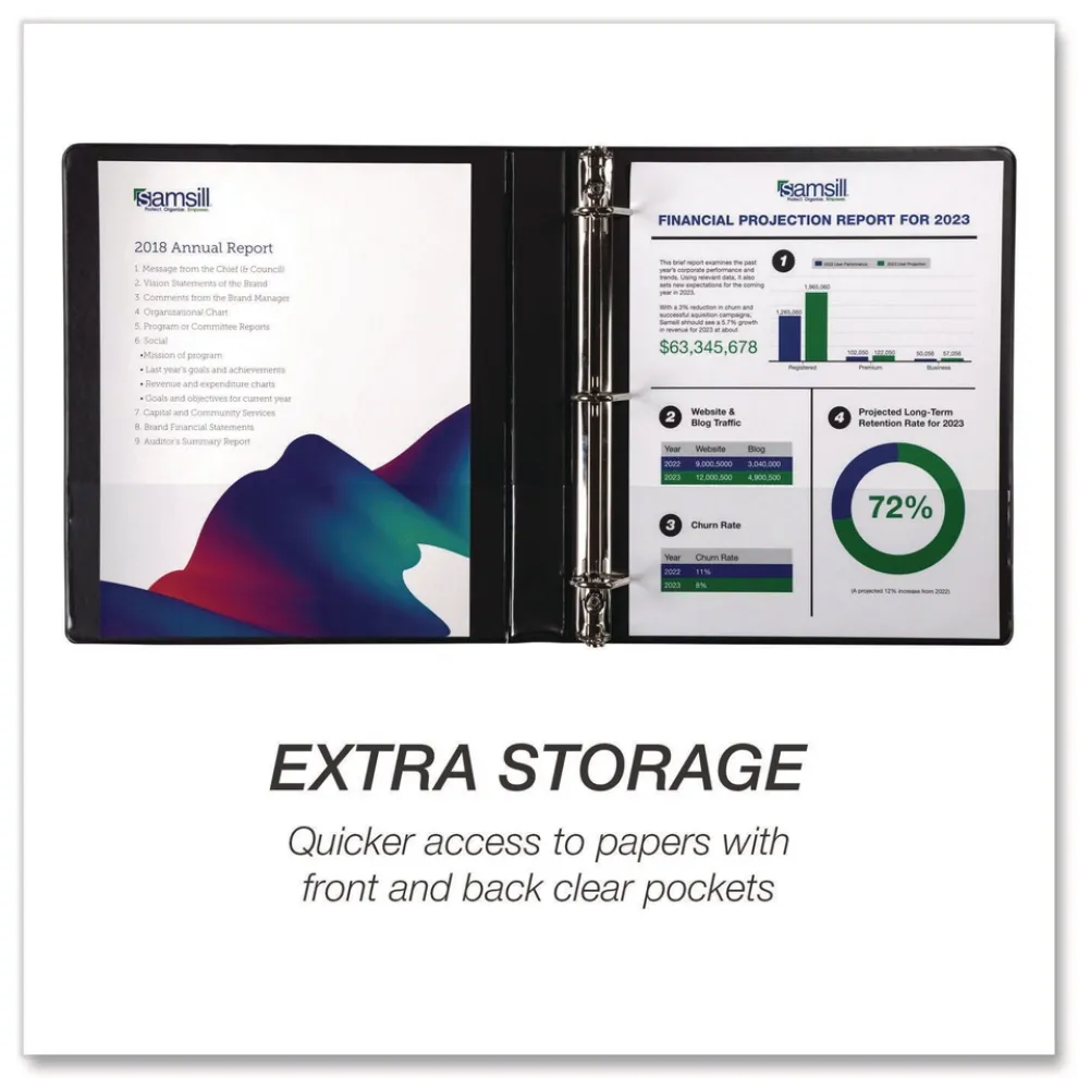 Samsill’s three-ring binders make indispensable home, office, and school supplies offering the economical paper storage and organizational value you’ve been searching for. This important document binder features a clear overlay along the front, back, and spine, allowing you to customize your presentations, projects, and more. Non-stick materials are used to make this product, which prevents ink transfer or lifting copy when materials are inserted into the cover or placed inside. Three binder rings with double boosters hold 8.5 in. x 11 in. letter-sized sheets with ease. The rings are mounted on the back lid, allowing pages to lay flat while preventing wear and tear on documents. Two clear interior pockets provide additional storage with enough space for notes, photos, business cards, or full-size pages. Get crafty and create a baseball card binder, portfolio binder, recipe binder, trading card binder, savings binder, etc. The possibilities are endless!