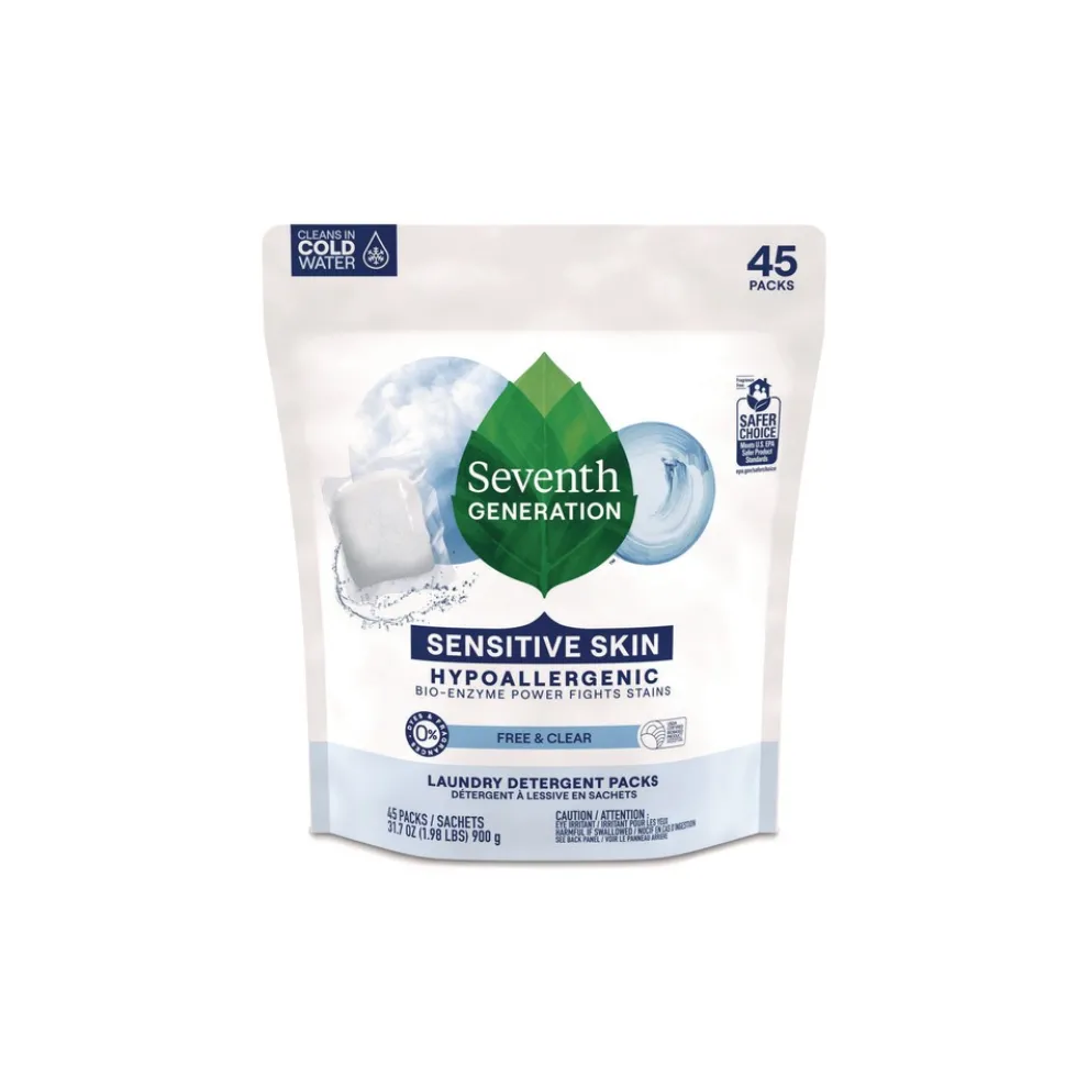 A truly safe and effective laundry pack option. Convenient single dose packs with no measuring, no guesswork, no waste. Non-toxic, four-enzyme formula fights tough stains and fully dissolves in all temperatures. Clinically tested hypoallergenic and non-irritating to skin. Free of dyes and artificial fragrances. Designed for standard and HE machines.