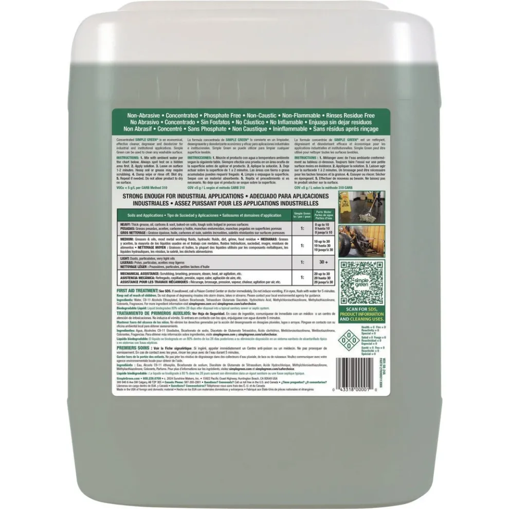 Simple Green Industrial Cleaner and Degreaser provides a safer alternative to caustic or acidic cleaners, bleaches and solvents. The trusted formula is non-abrasive and recognized by the U.S. EPA’s Safer Choice Program. Designed to be used on all washable surfaces, Simple Green powers away heavy dirt, grease, food residue and stains from countertops, sinks, tile, carpet, flooring, upholstery and more. The cost-effective concentrate can be used manually or in cleaning equipment such as such as floor scrubbers, dip tanks, carpet extractors, pressure washers, steam extractors and foamers. Easily cuts through tough grease, oils, cutting fluids, and built-up grime on equipment, engines, machinery, vehicles and manufactured parts making it ideal for a wide range of industries including janitorial, manufacturing, MRO, food processing, mining, automotive, transportation and engineering.