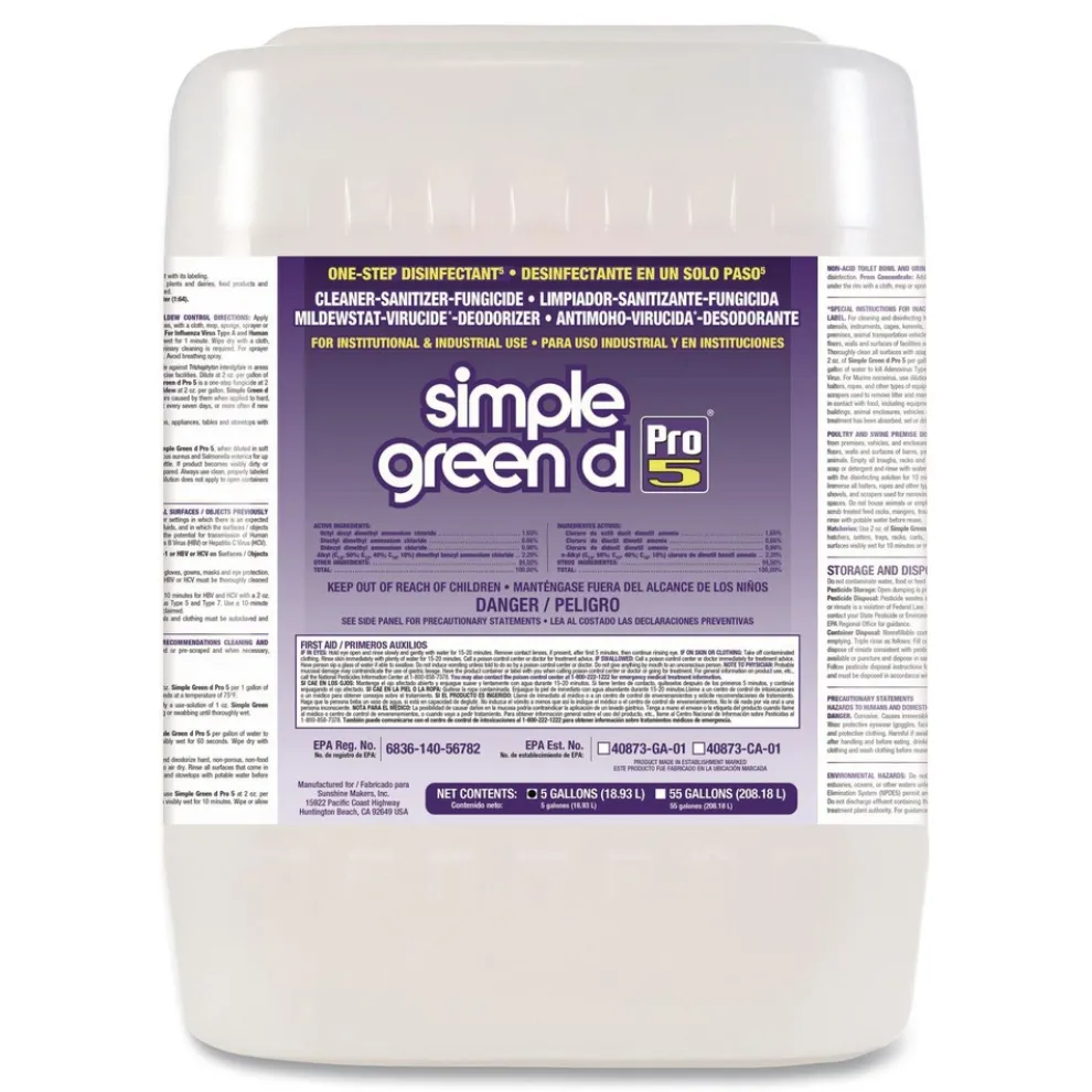 Simple Green d PRO 5 concentrated cleaner, deodorant, disinfectant, sanitizer, fungicide mildewstat, virucide. For Institutional and Industrial use. Kills the coronavirus (SARS-Related Coronavirus 2) that causes COVID-19 and cold and flu virus on hard, non-porous, non-food surfaces. Use in athletic facilities, bars and restaurants, bathrooms, business and office buildings, cafeterias, day care centers, food preparation areas, hotels, institutional kitchens, nursing homes, pet animal quarters, public restrooms, schools and colleges, USDA inspected food processing facilities and more.