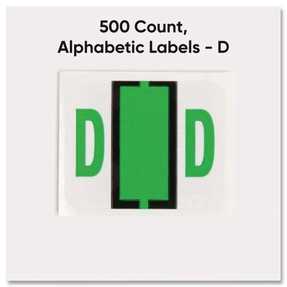 Keep files organized at a glance with these alphabetic labels that feature a wraparound solid color bar and a colored character printed on a white background. Colors are compatible with end tab systems using the bar-style format. Convenient dispensing box for easy peel off and application. Includes 500 labels per roll. Compatible with Tab Products 1283 series alphabetical labels.