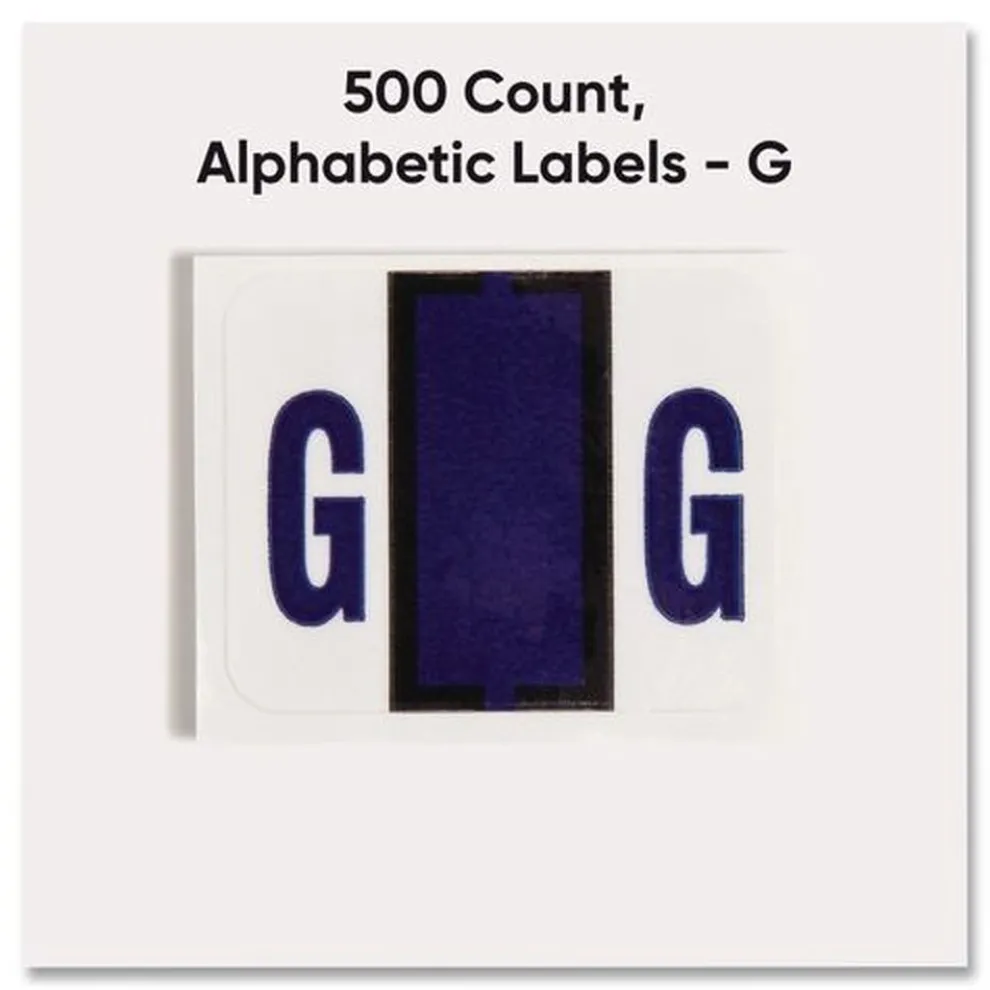Keep files organized at a glance with these alphabetic labels that feature a wraparound solid color bar and a colored character printed on a white background. Colors are compatible with end tab systems using the bar-style format. Convenient dispensing box for easy peel off and application. Includes 500 labels per roll. Compatible with Tab Products 1283 series alphabetical labels.