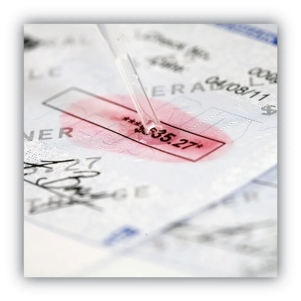 Hidden security feature releases a red stain if chemical alteration is attempted.