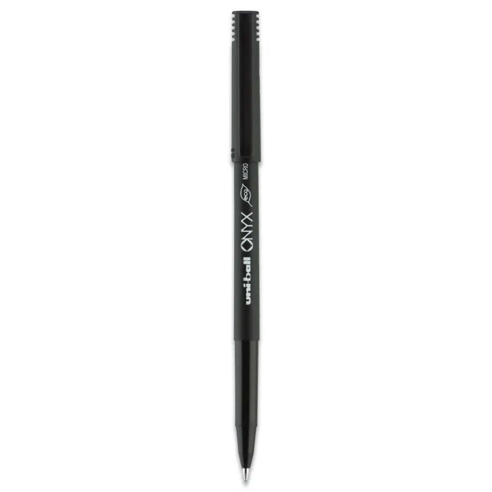 Stock your office, home or classroom with Onyx Rollerball Stick Pens from uni-ball featuring strong, long lasting tip sizes. This rollerball pen delivers the silky-smooth glide of a fountain pen without smudging for effortless writing. ONYX pens produce crisp and precise lines for intricate writing, making it easy to create super fine details in your drawings and diagrams. Capped roller pens are useful for a variety of tasks from note taking to signing checks and legal documents to uniquely embellishing fun and creative writing projects. Innovative uni Super Ink technology forms a strong bond with the paper, protecting from water, fading and fraud. A great economic and environmentally-conscious choice as this super sleek micro point roller pen is made from post-consumer recycled material.