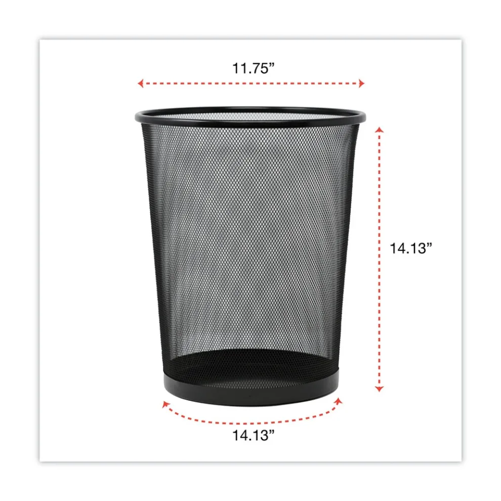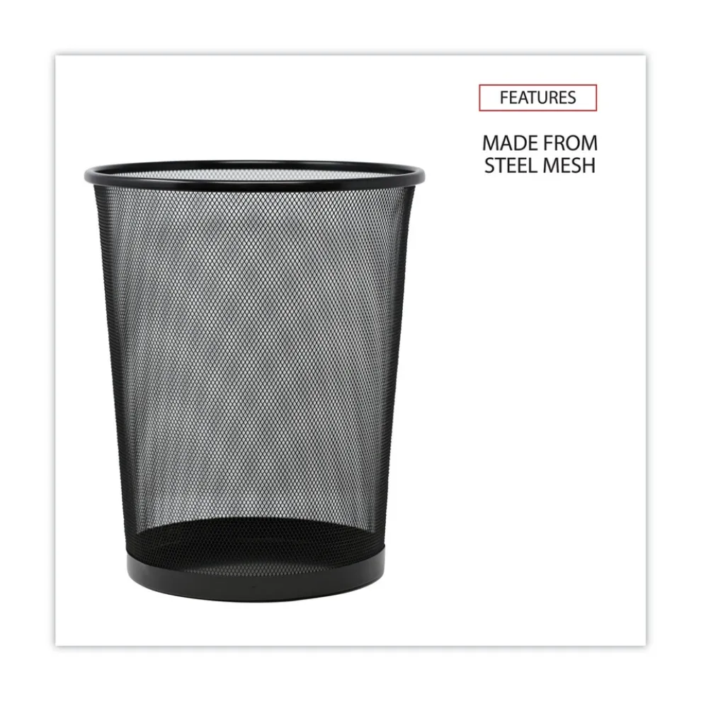 Durable and sturdy, black mesh wastebasket keeps workspaces neat and tidy. Stylish design of mesh looks great while keeping trash in its place. Use with or without a can liner. Solid rim makes it easy to carry and unload. Breathable mesh design prevents odors from getting trapped. Great for under the desk and inside work areas. Powder coated.