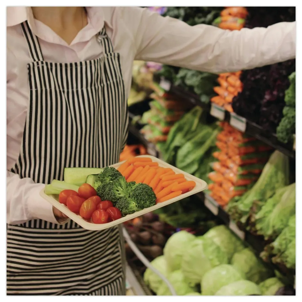 Made from unbleached plant fiber, an annually renewable resource and good alternative to petroleum-based trays. Soak proof, freezer safe, and contain no wax or plastic lining. For use with hot or cold food items, especially meat and produce. Great for restaurants, delis, grocery stores, supermarkets, meat counters, produce departments, and schools. Certified 100% compostable in 2 to 4 months in a commercial composting facility. Gluten free.