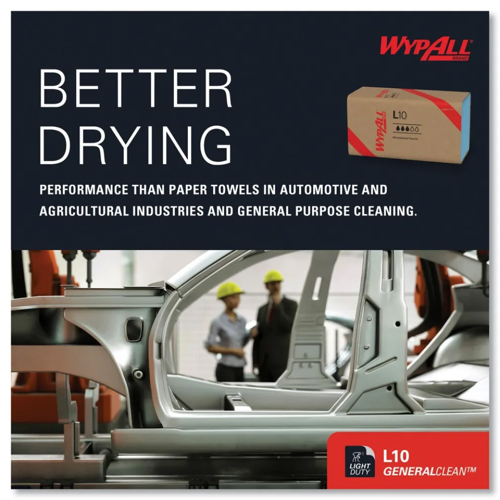 When you need a light-duty wiper to deliver results at an economical price, the WypAll L10 Windshield Towels are a great choice. They are soft, strong and absorbent, so they’re a favorite replacement for cleaning towels for spray-and-wipe jobs, glass surface cleaning, absorbing small liquid spills, detail and final assembly wiping. You’ll find these disposable towels useful in the automotive industry (glass polishing) and for general light-duty cleaning. They’re even gentle enough to use as hand wipes. Since these blue towels absorb better than towels and drink up liquids faster, you get better drying performance that can reduce usage overall. The banded format lets you access your dairy towels easily and quickly when you’re on the job. These are a terrific, reliable replacement for paper towels and can add efficiency to your business.