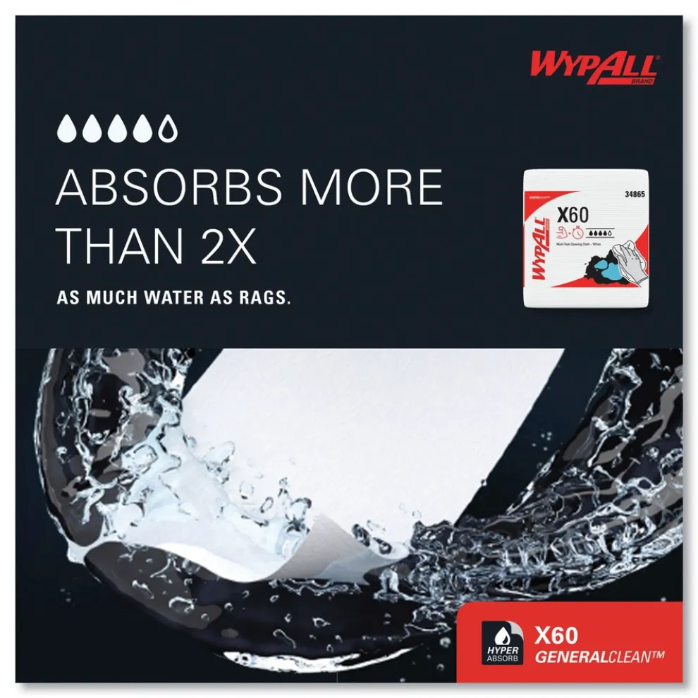 WypAll General Clean X60 Cloths absorb more water than rags. They bring the absorbing power of HydroKnit technology (for superior absorbency) to a lighter-weight cloth. Designed to outperform laundered rags, the clothes help raise the standard for general-purpose cloths at a terrific value. They don’t use adhesives or binders, so they’ll leave no residue behind and they’re reinforced for strength when wet or dry. These cleaning cloths are so sturdy that they can often be used more than once (once you’ve used them a few times, they’re disposable). They’re designed to reduce waste so you spend less.
