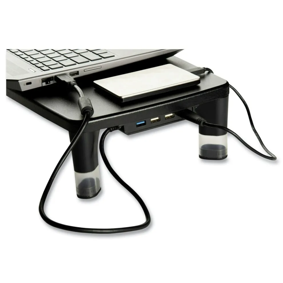 Height-adjustable stand is great for computer monitors, laptops, TVs, speakers, printers and more. Plug-and-play 4-Port USB hub allows you to connect three USB 2.0 Devices and one USB 3.0 Device to your computer keeping everything you need right at your finger tips. Conveniently connect or charge a variety of devices including mice, keyboards, video game consoles, external hard drives, smart phones (adapters not included), digital cameras and flash drives. Easily adjust height settings from 2.76 in. to 3.94 in. to get your monitor to a comfortable height for viewing. Quick and easy assembly. Anti-slip rubber feet protect work surface. Holds up to 33 lbs.