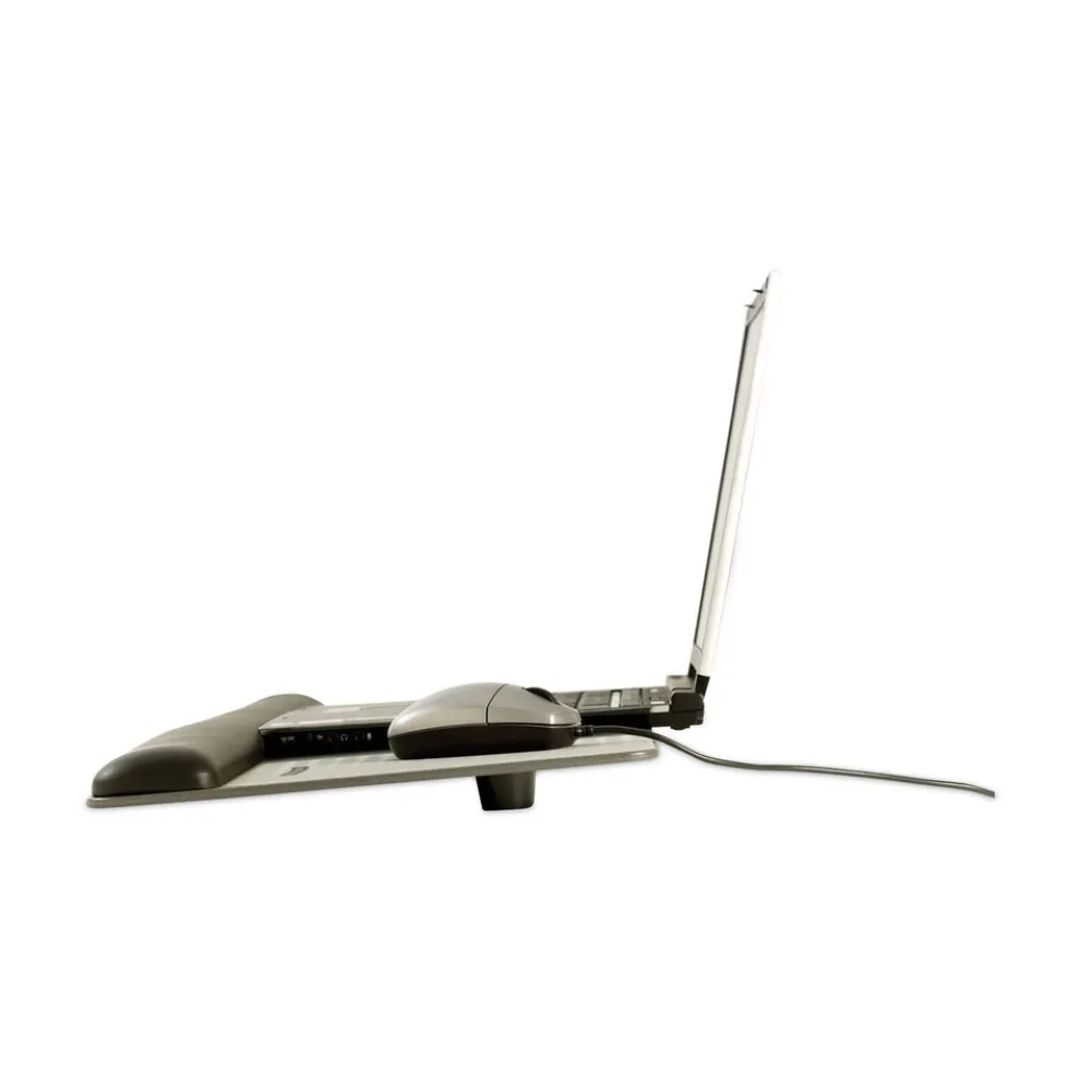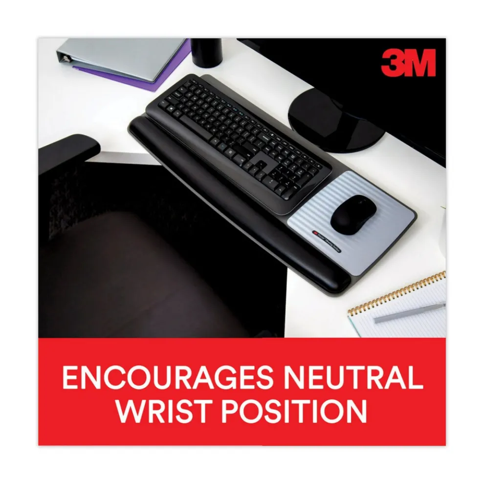 3M Gel Wrist Rest for Keyboard and Mouse has a tilt adjustable platform for comfort and keeps keyboard and mouse in place. The easy to clean leatherette cover has antimicrobial product protection which inhibits the growth of microorganisms, such as bacteria, on the product surface, that can cause stains, odors and product degradation. Includes a Precise Mouse Pad with battery saving design that mounts on the right or left side of the platform.