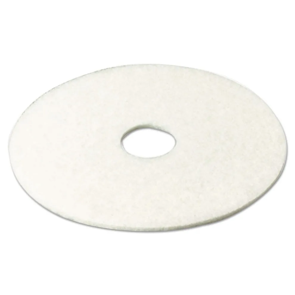 3M White Super Polish Pad 4100 is used for light cleaning under automatic scrubbers and removes soil and scuff marks with minimal dulling of finish. Uniform distribution of fine cleaning particles throughout the pad’s fibers, not just on the surface, distinguishes it from much of the competition. Durable, conformable polyester fibers provide maximum pad-to-floor contact, and open construction resists loading and clogging. For use with rotary and automatic floor machines running at low speed (175-600 RPM). Use for light daily cleaning, spray buffing, and dry buffing soft finishes. This polishing pad is also used on wood floors. The pad is reversible.