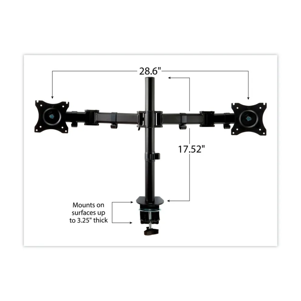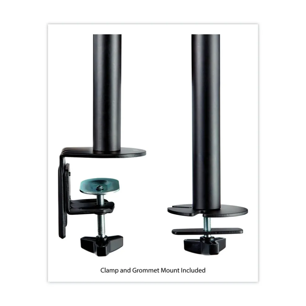 Free up valuable desk space and bring your monitor to a comfortable viewing height and distance while sitting or standing. Sturdy steel construction holds two monitors up to 28.5 in. width and 20 lbs. each. Easily clamp mounts to surfaces up to 3.25 in. thick, no tools needed (grommet mount also available). Cord management clips on the arms and pole. Fully adjustable as you can set height on 15 in. pole rotation (portrait to landscape), 360 degrees tilt (forward/back) from +45 degrees to -45 degrees, pan (left/right) from +90 degrees to -90 degrees and arm swivel with clamp mount (front to back) to 90 degrees.