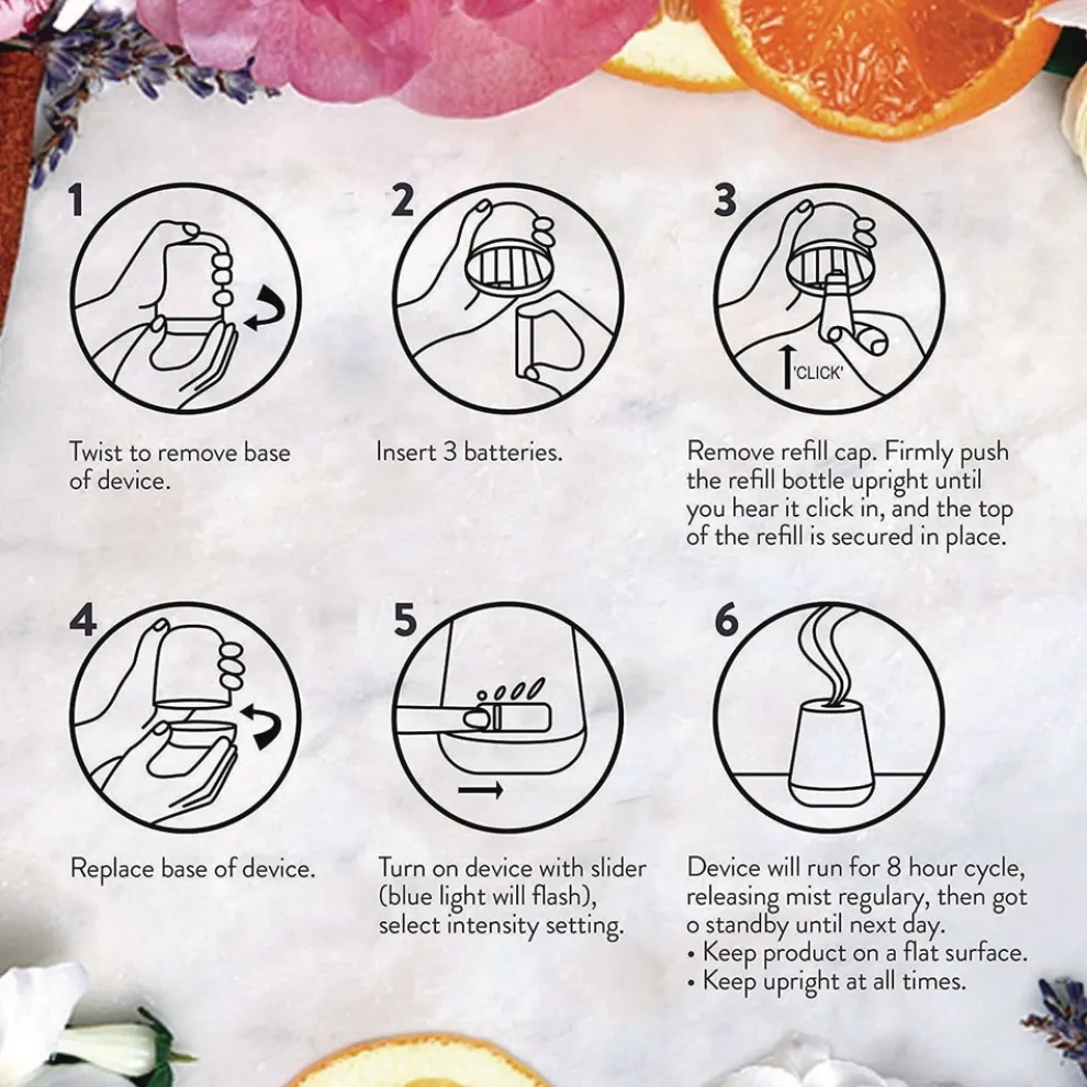 Contains natural essential oils. No water needed as oil diffuses into a mist through microscopic holes in the vibrating plate. Each refill lasts up to 45 days on the lowest intensity setting. For use in Air Wick® Essential Mist Diffusers. Three intensity settings for ultimate fragrance control.